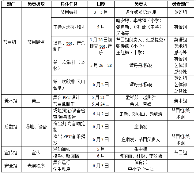 2.每个节目的音乐、PPT制作、编辑。负责人:各年级英语老师