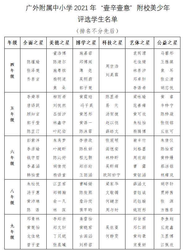 根据《广外附属中小学“壹辛壹意”附校美少年评选活动方案》,经自主申报、资格审查、班级评议、年级评议、学部评审、学校终审、名单公示等程序,决定授予陈瑾瑜等21名同学“全面之星”、 董浩博等23名同学“美德之星”、 施嘉蓉等23名同学“博学之星”、 周世浩等18名同学“科技之星”、 袁芮潆等23名同学“艺体之星”、马馨彤等23名同学“公益之星”荣誉称号,现予以表彰。(详见附件)