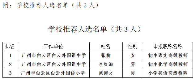 经个人申报和我校职称评审申报材料审核小组初步审核,现将我校拟申报中小学(幼儿园)教师职称评审人员的申报材料进行网上公示。公示通知内容包括:推荐人选的申报材料在职称申报系统的网址、查看路径、公示账号及密码,推荐人纸质申报材料公开位置等,公示时间(不得少于5个工作日),同时公布市、区教育局纪检、单位投诉受理部门和电话。近五年内有跨校调动的,还需在原单位公示。若对申报人材料有异议,请电话或书面向市、区、学校投诉受理部门反映,反映情况的电话和书面材料要自报或签署(手写)真实姓名,不报或不签署真实姓名的,一律不予受理。
