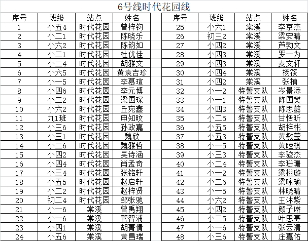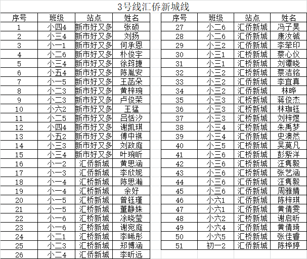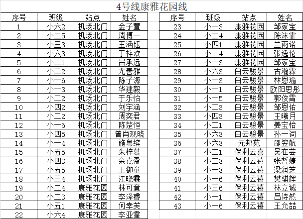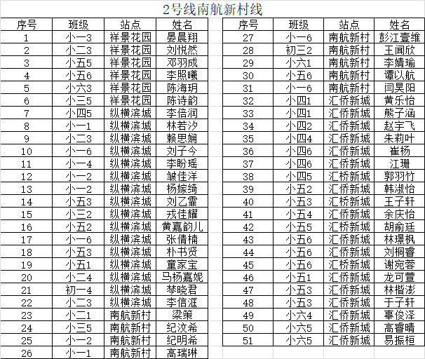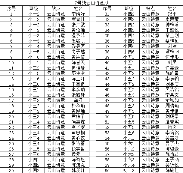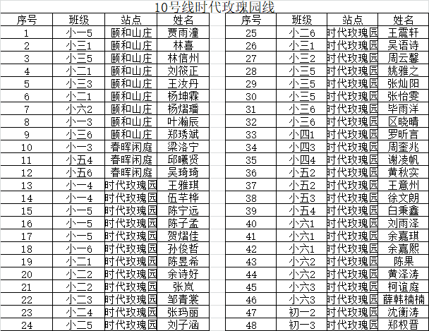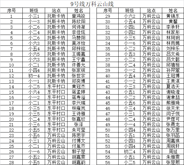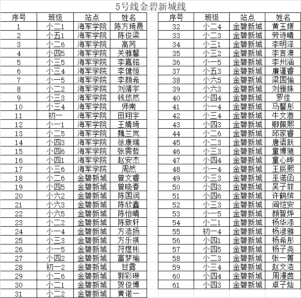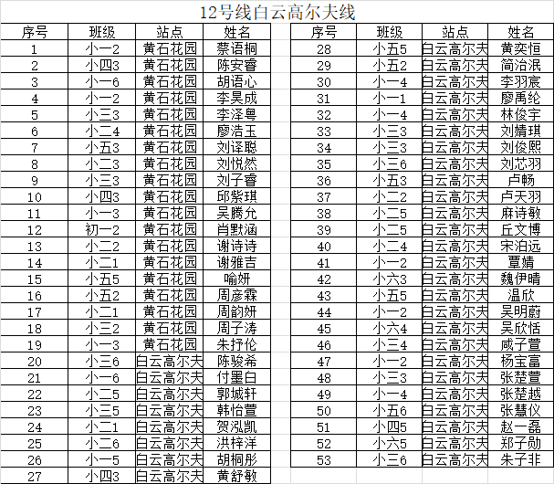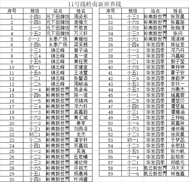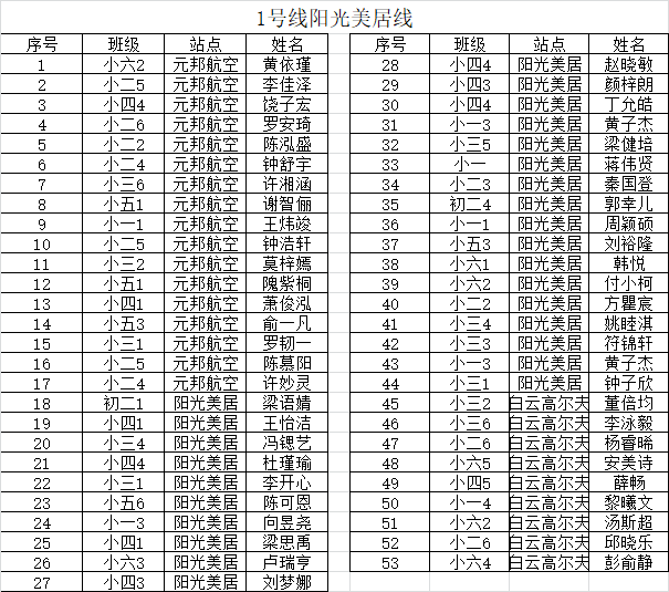 根据统计,目前5号线金碧新城线、7号线云山诗意线、9号线万科云山线和11号线岭南新世界线等已超过校车规定乘坐人数53人,学校拟于12月23日9:00在报告厅现场抽签确定乘座校车同学名单,敬请大家届时前来参加。12条校车线路名单如下: