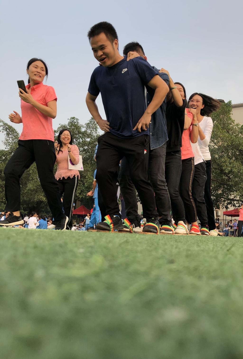 我们每个人都有一双脚,日常生活中我们都可以很自如地去操控它们,假如将你的双脚与第二个人、第三个人,甚至更多的人的脚绑在一起时你还能自如的操控它们吗?伴随着“左、右、左、右”的口号声,同舟共济大脚板比赛分别在14和15日下午分小学、中学进行,参赛10支队伍的老师们将双脚分别站在两块木板上,步调一致地向前冲去。