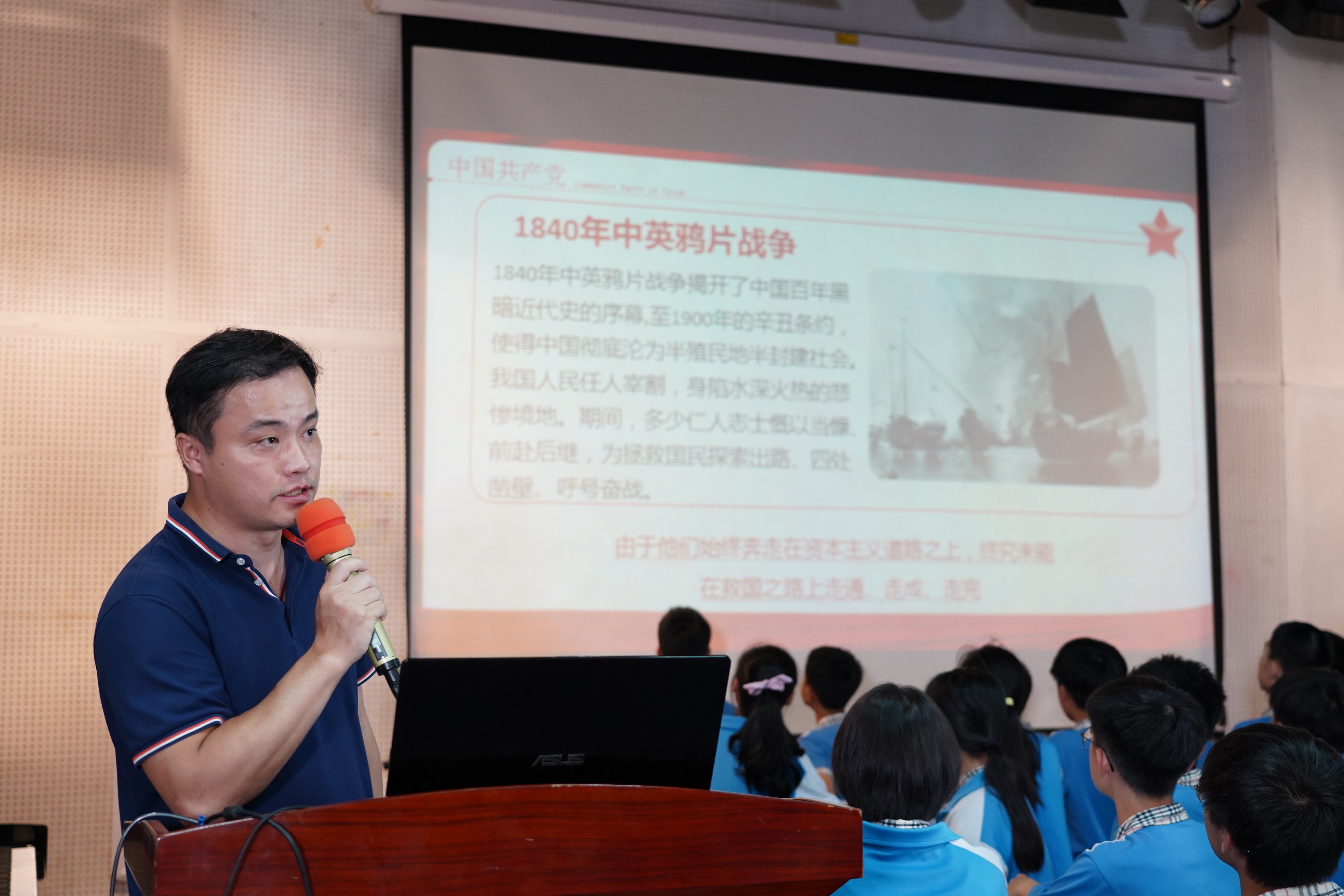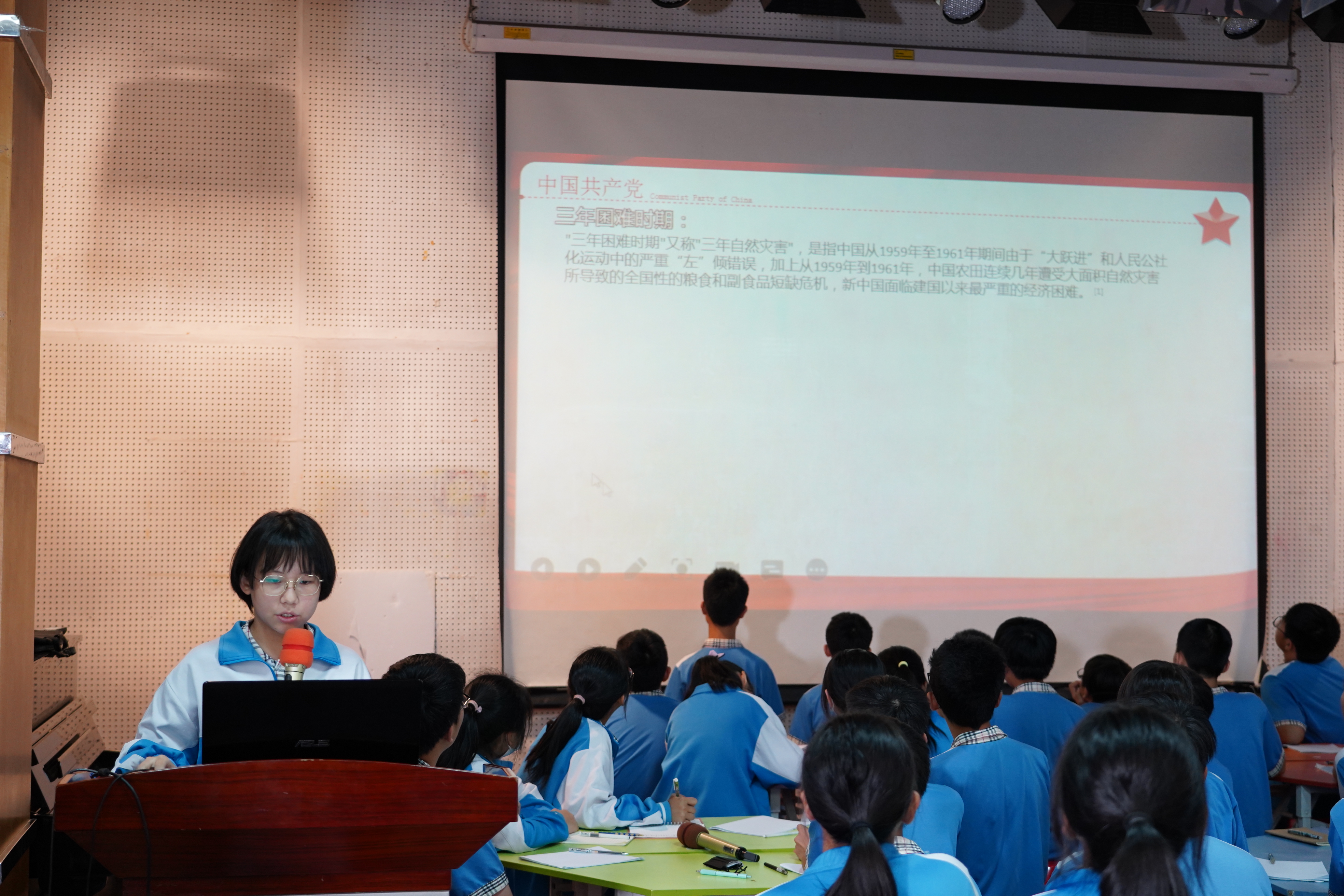 初二(3)班陈鑫老师则把社会主义发展史向同学们娓娓道来。他采用分类归纳的方式,把社会主义发展史分为:社会主义改造阶段、曲折发展阶段、改革开放阶段、飞速发展阶段。还介绍了重要时间节点里的历史性会议,使同学们对我国的社会主义发展历程有了全面的印象。同时通过小组汇报的方式,让同学们分组轮流上台向大家展示了各阶段我国工业、农业、科学技术等领域的发展成就,强调知识的内化。