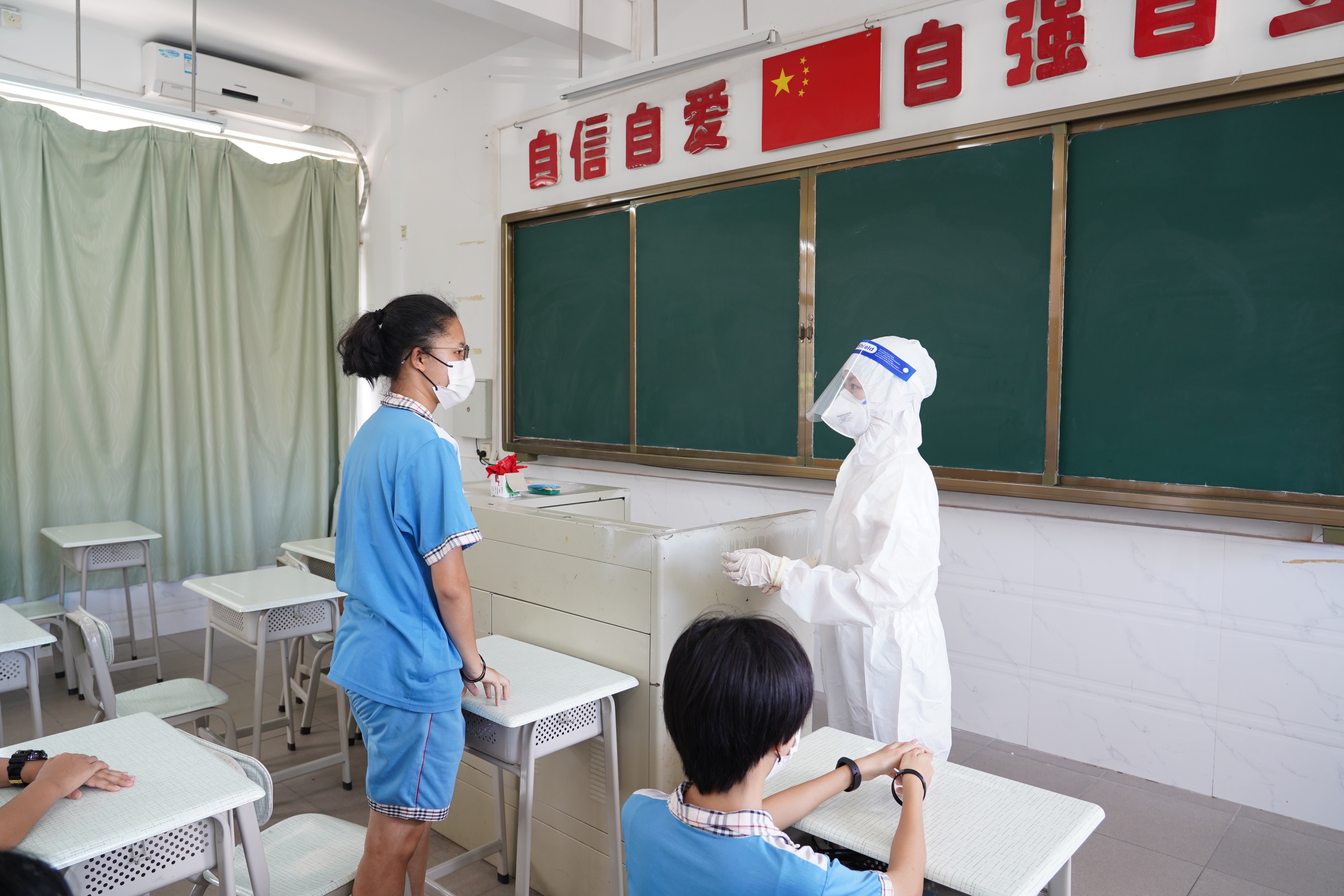 现场模拟6:学校校医穿着好防护服,到核酸检测呈阳性的学生所在课室,将该学生转移到临时隔离室。