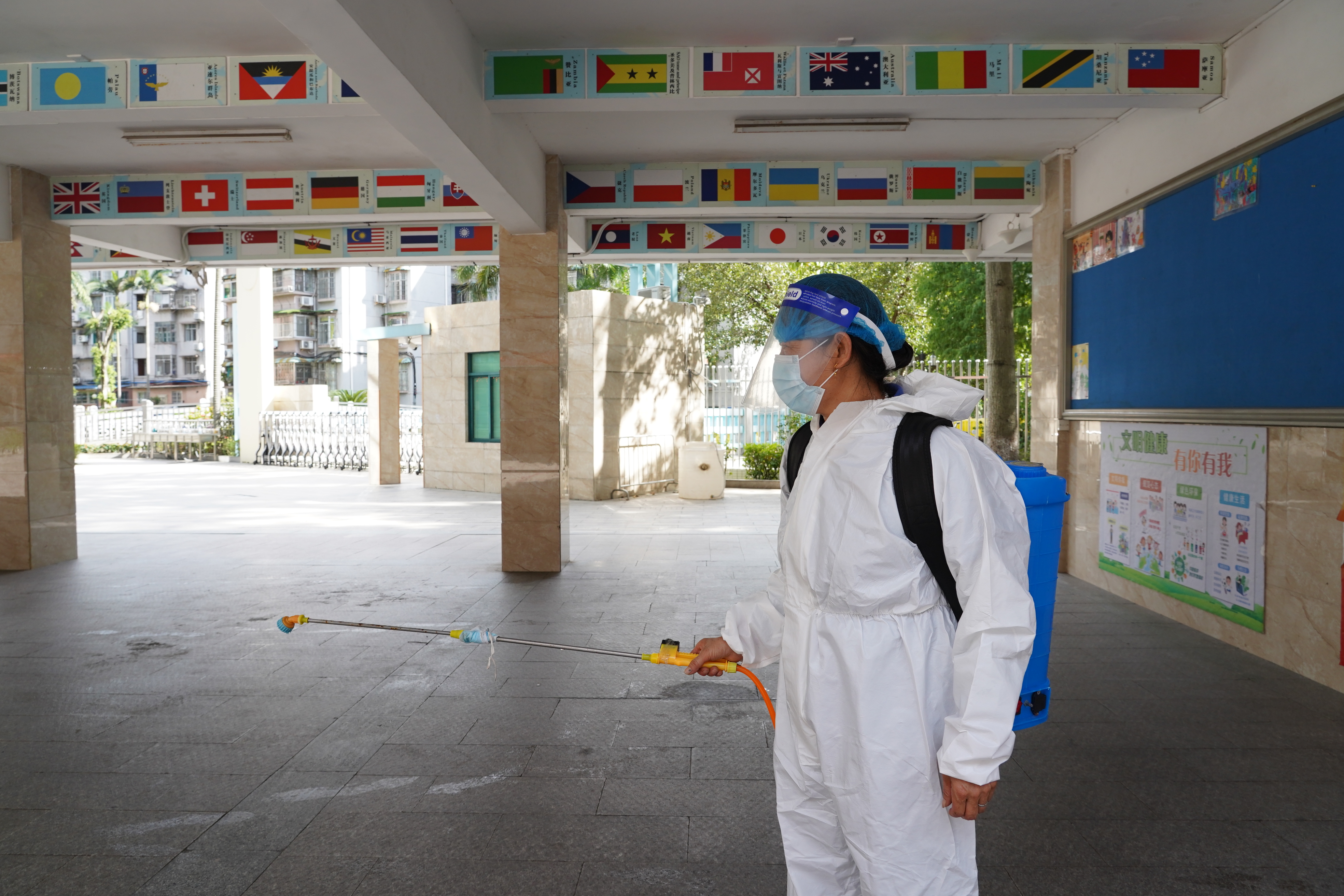 现场模拟9:保洁人员在全校开展消毒清洁工作。
