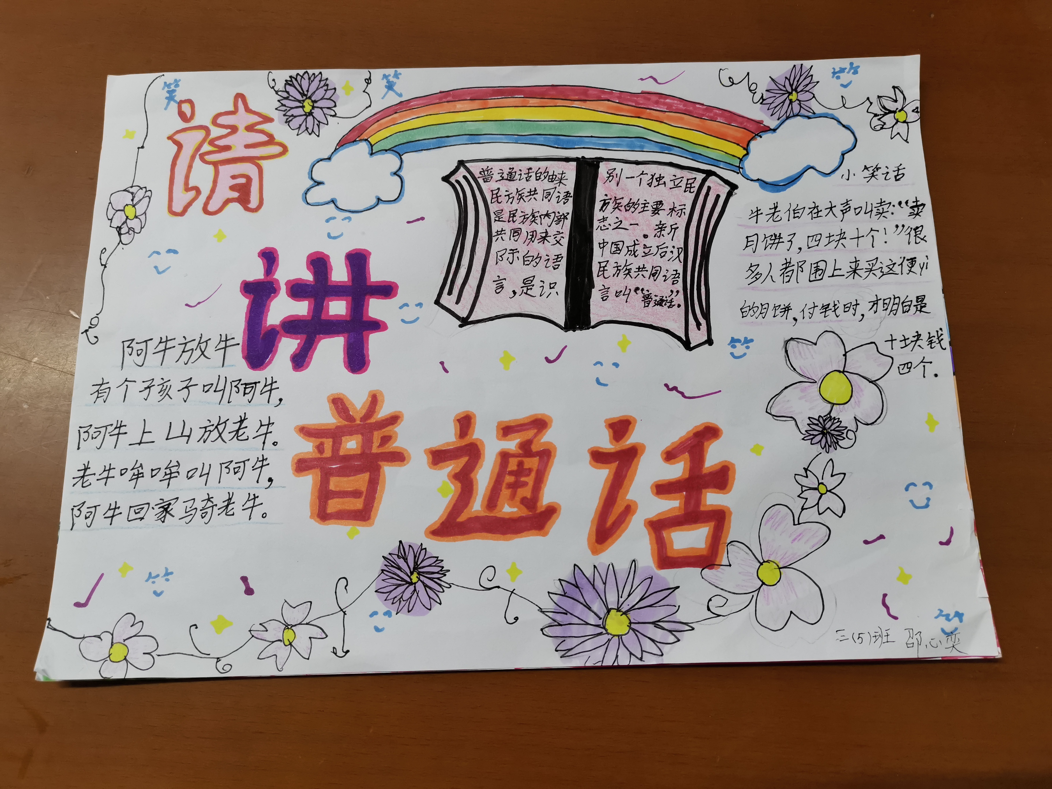 说好普通话,迈进新时代。三年级学生动手制作了精美的读书卡,号召全校师生说一口标准文明的普通话,写一手规范漂亮的汉字,让我们每天都能在抑扬顿挫中感受普通话的魅力,在横平竖直中欣赏汉字的风采。