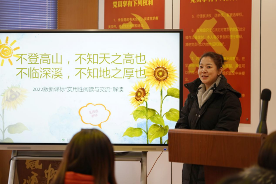 六年级组王鑫鑫老师对新课标“实用性阅读与交流”部分进行了自己的解读。王老师首先分享了新课标特色,重点谈了自己对四大语文核心素养的理解;然后王老师从如何提高学生语文素养的角度,在“探究实用”“探究情境”“探究贯穿”三个方面进行例举。王老师强调阅读与交流教学:具备实践性特点;融合性强,生活化突出,有阶梯性;情境活动重真实;过程评价必实践。