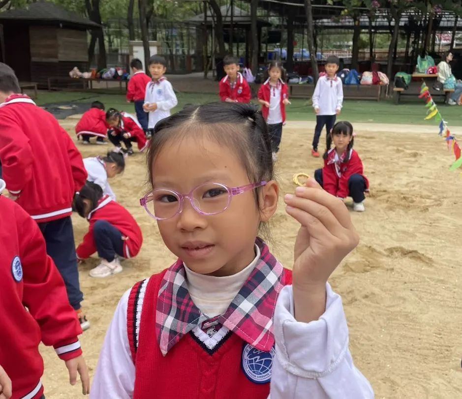 “沙中淘金”也是孩子们最感兴趣的活动,他们人手一个小筛子,眼睛紧紧盯着那一堆沙子,仿佛里面藏着无尽的宝藏,迫不及待地开始了淘金沙游戏。小手有节奏地晃动筛子,沙子细细地从筛孔漏下,就像时间的流沙。突然,一抹金色在阳光下闪耀,那小小的金粒如同夜空中最亮的星,瞬间点燃了孩子们的热情,欢呼声此起彼伏,沙池边满是快乐。