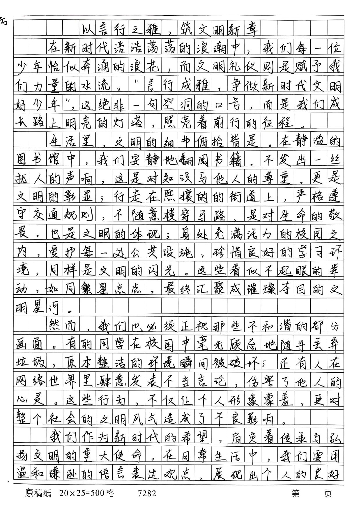 在获奖作品中,既有以校园生活视角记录文明细节的《捡起一片纸,种下一颗星》,也有引经据典探讨礼仪传承的《雅言润心,雅行致远》;七年级学生以《让文明之花开在青春枝头》讲述校园礼仪教育,八年级学生则用《携手共进,言行成雅》呼吁于细节入手,从小事做起践行文明修养。这些作品将抽象的道德准则转化为鲜活的生活场景,体现了同学们对文明礼仪的独特诠释,更彰显了作为新时代少年传承美德、共建和谐社会的责任感与担当。