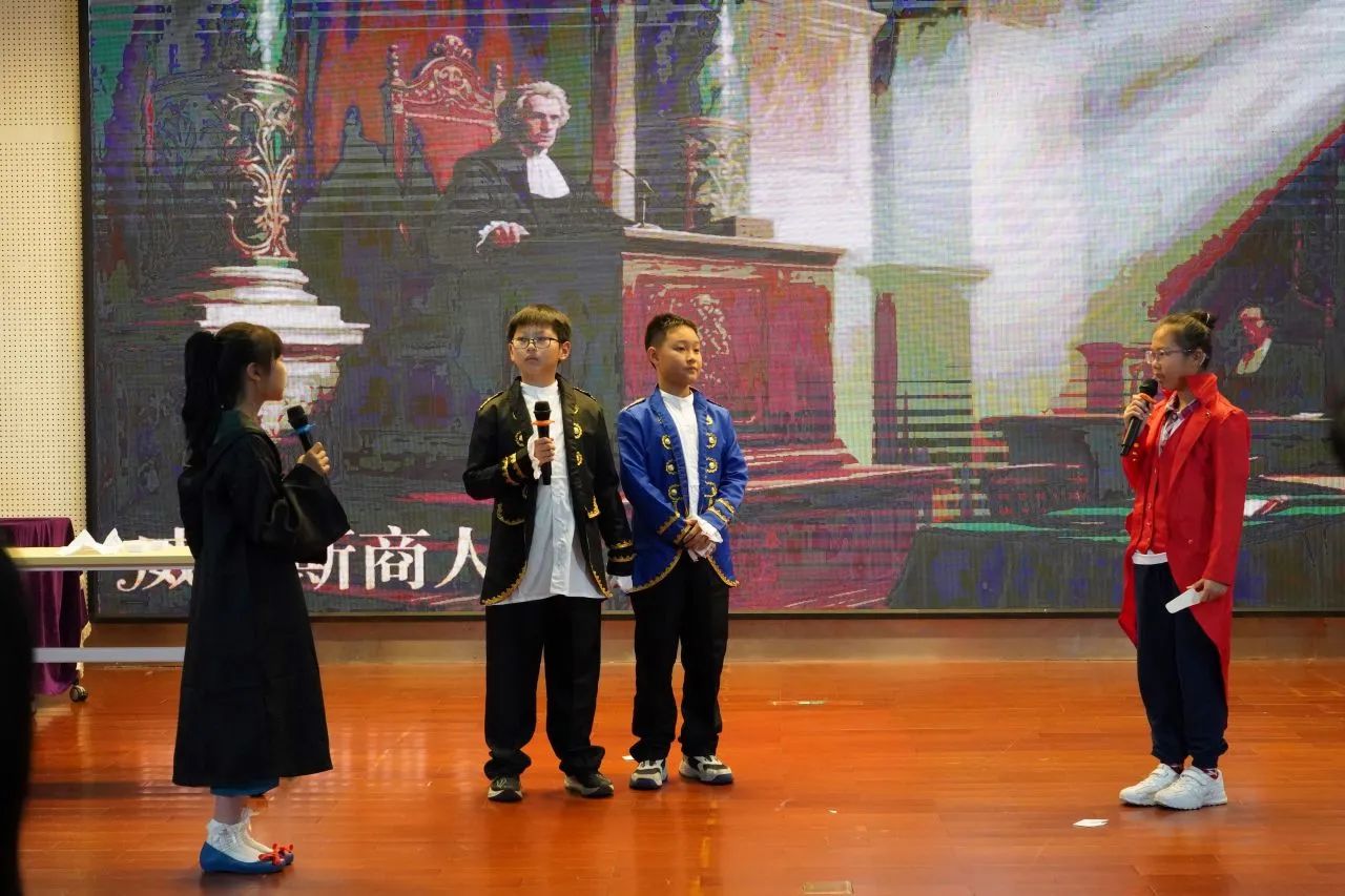 五(6)班带来的绘本剧是《The Merchant Of Venice》。在威尼斯的一座桥上,陈利垚扮演的Bassanio和冯劲博扮演的Antonio一起去找钟紫梒扮演 Shylock借钱求婚。Shylock提出,如果 Antonio没能及时还清债款,就要从他身上最接近心脏的地方割下一磅肉。最后,Bassanio求婚成功,Antonio却没能及时还清钱。高乐希扮演的Porsia帮助 Antonio赢得了官司,保住了性命。