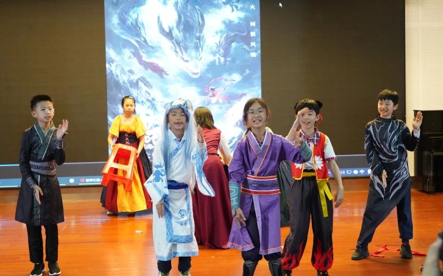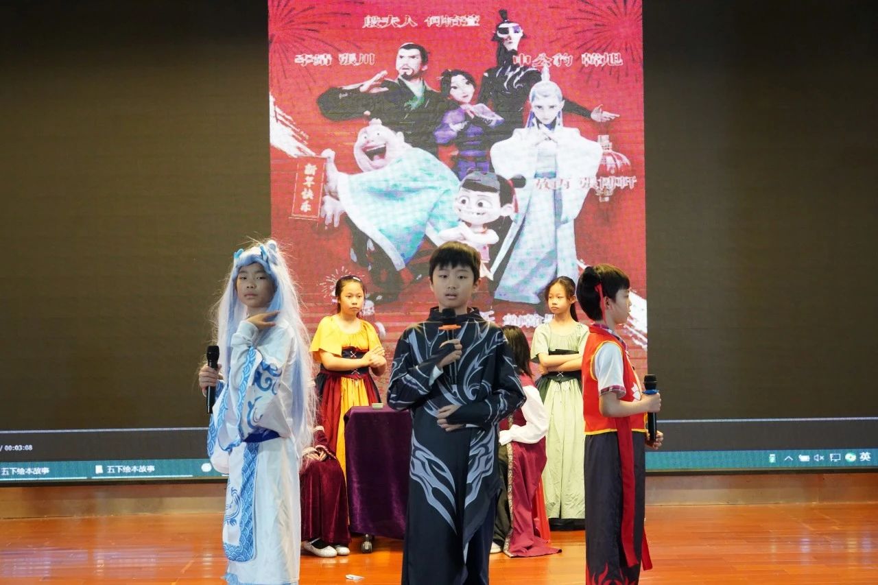 五(3)班的节目《Love》别具匠心。孩子们读完绘本并分享感受后,把《Tough Love》里后妈严厉的爱、《Nezha》里父母对孩子的疼爱、《The Wizard of Oz》里的友谊创编成一个故事。现场,小演员杨泳晴、谭昕饰演的母女娴熟地英文唱诵,通过投入的表演和富有感染力的情感表达,生动地展现了各自的性格特点和内心世界。刘翰墨同学饰演的哪吒,将委屈又愤怒的情绪诠释得十分到位,他与敖丙真挚情谊的升华更是赢得现场热烈的掌声。所有演员地道的英语口语,让观众们深深沉浸在英文绘本故事的精彩之中。