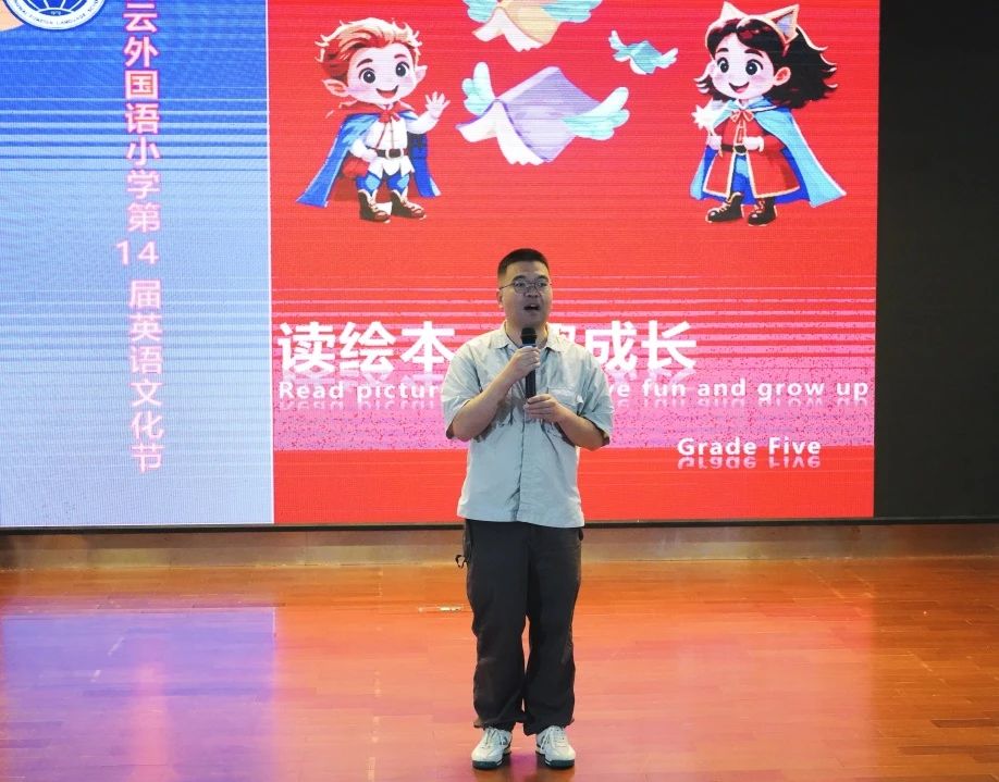 比赛伊始,五年级级长吴悦为参与活动的孩子们加油鼓劲,他说道:“绘本,是孩子们认识世界的一扇窗,而英语则是连接世界的桥梁。今天的英语绘本故事表演,每一句台词、每一个动作,都源自五年级孩子们自己的创意。让我们一起为他们加油,共同开启这场奇妙之旅!”