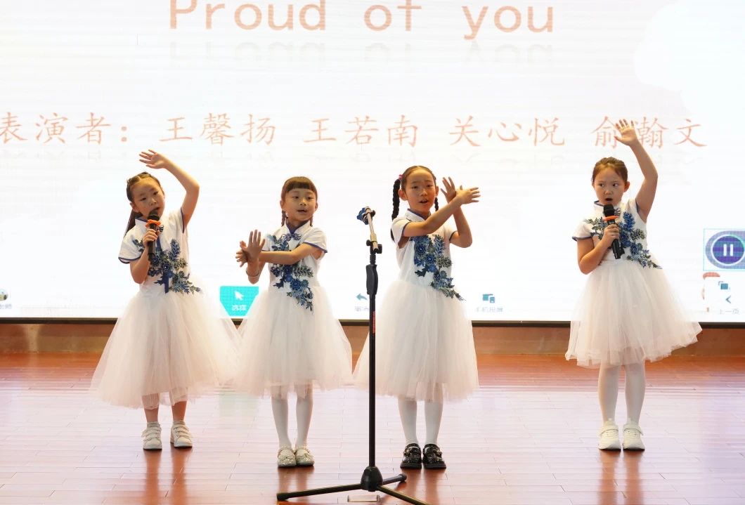 二(5)班《Dance Monkey》,彭胡君君、李伊宸以动感的节奏,将这首流行歌曲演绎得充满活力。节目《Proud of you》,王馨杨、王若南、俞瀚文和关芯悦四位同学以深情的歌声,传达了对彼此的骄傲和鼓励,展现了真挚的友谊。