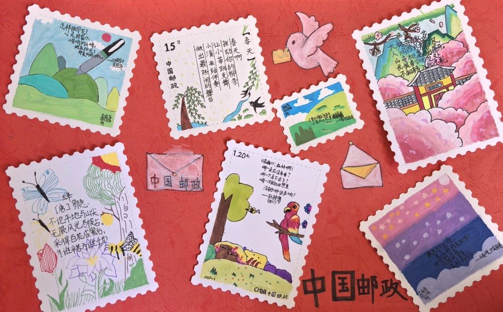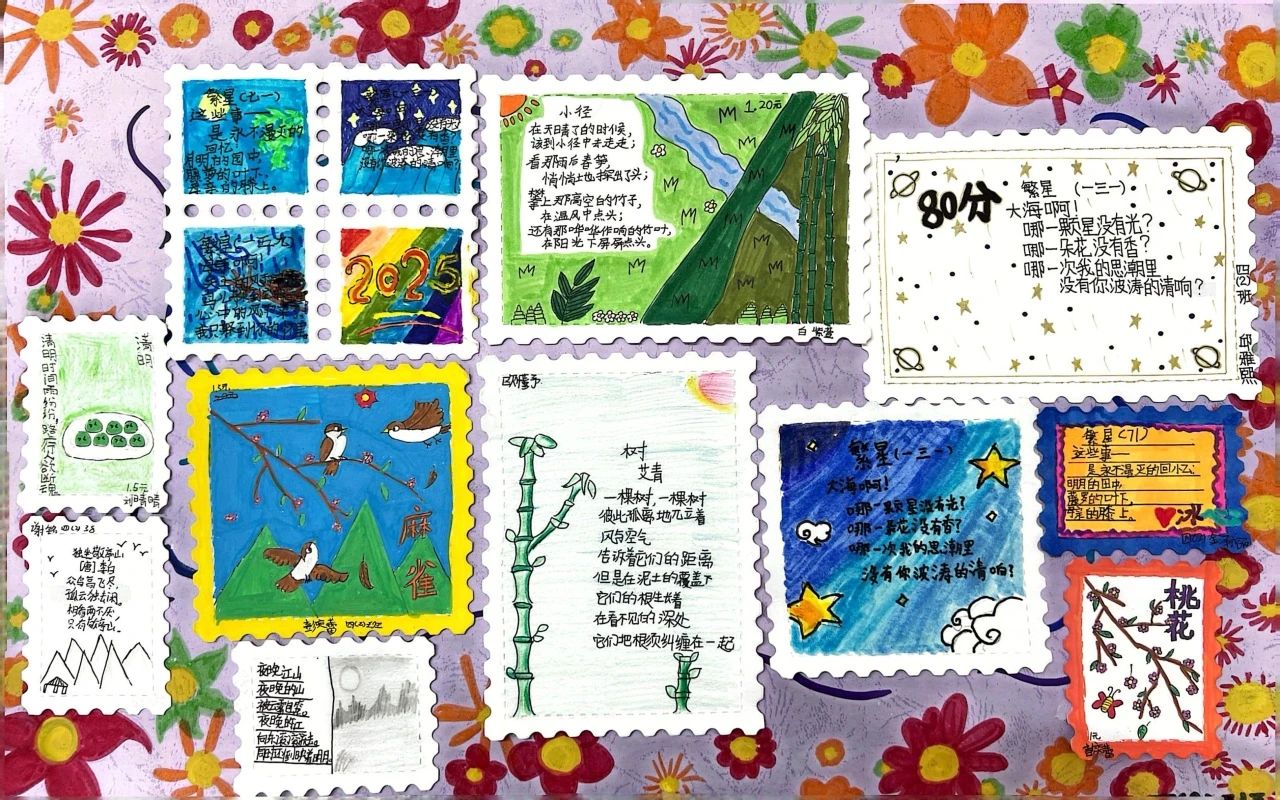自2025年4月7日读书节拉开帷幕,四年级全体学生便满怀热忱地投身于这场充满创意与文化底蕴的活动之中。此次活动独出心裁地将邮票艺术与诗歌创作深度融合,以笔墨勾勒童心,用方寸展现万象,为师生们带来了一场跨越时空的文化盛宴。