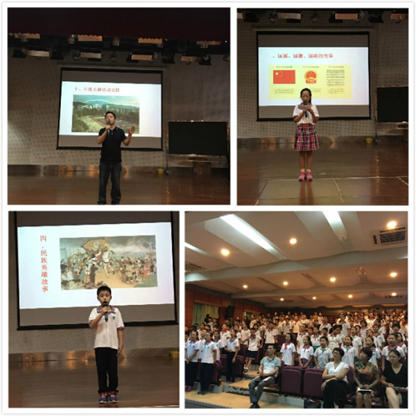 活动在升旗礼中拉开了序幕,小主持分工明确,声音抑扬顿挫,很好地引导各个环节、各个节目有序进行。在活动进行中,《国旗、国徽、国歌的故事》告诉我们国旗、国徽、国歌是我们祖国的象征,无论在何时何地,我们都要爱护它。课文朗诵《梅花魂》让我们感受了一位身在异国的华侨老人一颗眷恋祖国的心。《民族英雄故事》提醒我们今天幸福无比的生活来之不易,是那些视死如归的英雄先烈用自己的鲜血和身躯换来的,是英雄们用美好的青春,用闪光的年华,迎来了春天,迎来了光明。诗朗诵《请英烈们放心》表达了孩子们在幸福的今天,没有忘记历史,没有忘记这些英雄,也没有忘记先辈们给我们留下的优良革命传统。在《里约奥运女排夺冠》视频中,中国女排顽强拼搏、永不服输,感动了在场的师生,也让我们知道爱国不仅仅体现在保卫国家,保卫人民的战争中,也表现在为国争光的奥运赛场和平凡的工作岗位。接着同学们大声朗读《爱国的名人名言》,声情并茂地合唱《龙的传人》,充分展现了自己对祖国的自豪感,增强了爱国热情。