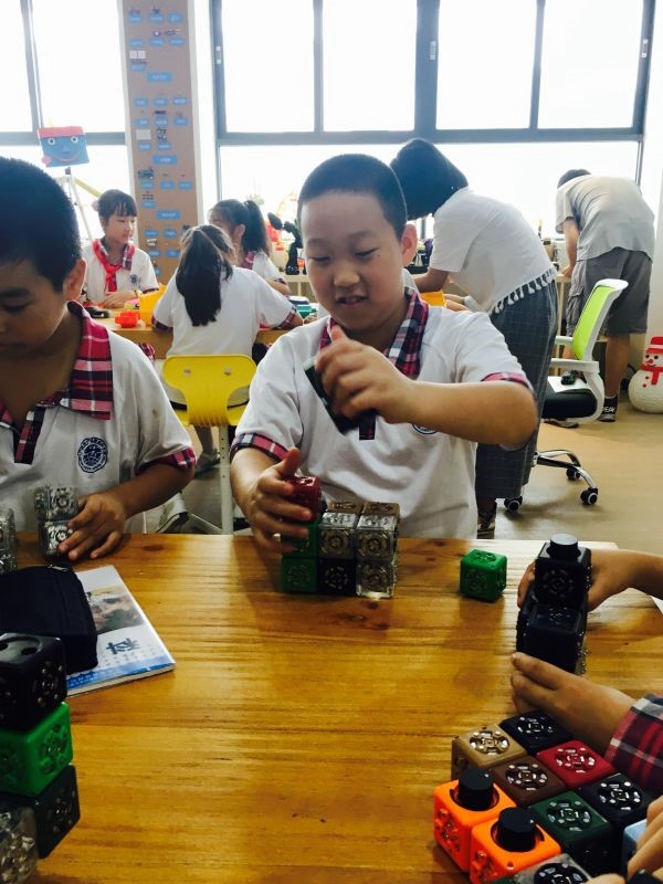 小方块拼在一起,居然能变成会跑会叫的小狗!同学们尝试将不同颜色的方块拼在一起,有了了不起的发现。他们发现可以用光线控制小狗奔跑的速度;发现换掉几个方块,小狗就能化身机器人管家,为人类服务。同学们用这些神奇的小方块做出了风车、传送带、发光的汽车,在不断的尝试中,大家很快理解了各种电子元件的作用。