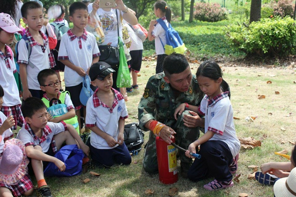 下车后,在亲切的消防官兵们的带领下,老师和全体同学来到防火实操演练现场。