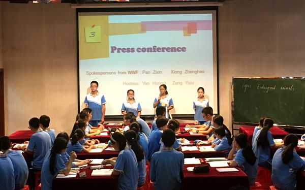 张晓鹏老师的“Endangered animals”英语课,用了成龙呼吁保护濒危动物的英文宣传片作为导入,从视频中学生了解到了当下濒危动物的种类,为下面的学生活动提供了写作材料,开篇便埋下伏笔。其中,在学生角色扮演活动中——由2名学生扮演WWF(世界自然基金会)的新闻官回答同学关于濒危动物的提问,一名记者的问题令人印象深刻。他向新闻官提问到:“如果您遇到了濒危动物的袭击,而您手里刚好有一把枪,请问您是会用枪杀了这个濒危动物还是让它杀了您?”而学生新闻官思考了几十秒后有条不紊地回答道:“我会首先选择用其他办法吓退这个濒危动物,让它放弃对我的袭击。如果这个办法不管用的话,那为了自己的生命安全我最后还是会选择杀掉它,但是我会带走它的基因以求通过克隆技术能克隆出它的后代以至于这种动物不会灭绝。”精彩的提问与绝妙的回答都赢得了在场师生们自发性的掌声。这不仅展示了附中学子们平时训练有素的口语能力、临危不惧的现场应变能力,也体现了附中学子们在学习上的敢想敢问、不断创新的精神。