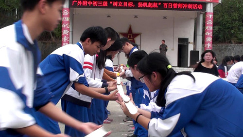 本网讯为充分调动初三毕业班师生冲刺中考的积极性,更好的激发毕业班学生的学习激情,营造浓厚的备战中考的学习氛围, 广外附中2016届初三级“树立目标,扬帆起航”百日誓师冲刺活动,在广州市穗华心国防教育基地隆重举行,学校领导和初三年级190余名师生参加了此次大会。