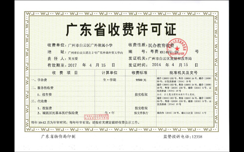 根据《中华人民共和国民办教育促进法》,省物价局、省教育厅《广东省物价局广东省教育厅关于规范我省民办中小学校教育收费管理的通知》(粤价〔2009〕59号)和广州市有关文件,白云区发展和改革局对我校2014年秋季入学新生的有关收费做了批复。据了解,学杂费实行“新生新办法、老生老办法”的原则,即此前入学的学生,按原收费标准执行。目前学校已按有关规定办理了《广东省收费许可证》,从2014年秋季新生进校起执行新学杂费标准,原在校学生仍按原收费标准执行直到毕业。(办公室)
