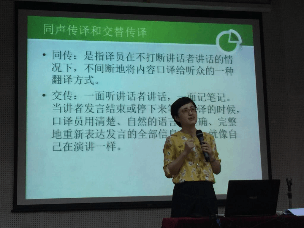 刘教授和同学们分享了关于同声传译的工作场合和发展简史、同声传译的设备发展、同传译员的工作环境以及做一个优秀的同传译员所具备的特质。同学们听得很入神,对同传这个职业也产生了很大的兴趣。刘教授指出做一名优质同传译员除了应该有良好的母语和外语能力、宽广的知识面之外,还应具有良好的反应能力,才能够做到临危不乱。