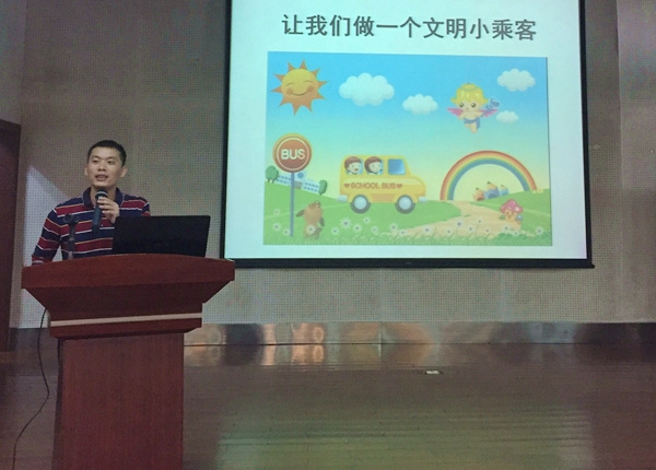 会上,学生处朱副主任首先向学生介绍了乘坐校车易发生的安全事故,并从乘车时要有序排队等候,不挤不抢,在车内不得将身体、头、手伸出窗外,不向车外抛物,不在车内打闹或做影响驾驶员注意力的事情等方面进一步强调了乘坐校车的十个安全要点,使学生进一步明确了乘坐校车的要求。接着,从跟车老师反馈的乘车情况对表现良好的同学进行了表扬,希望全体学生能严格要求自己规范乘车安全,为自己、为他人撑起一把安全保护伞。