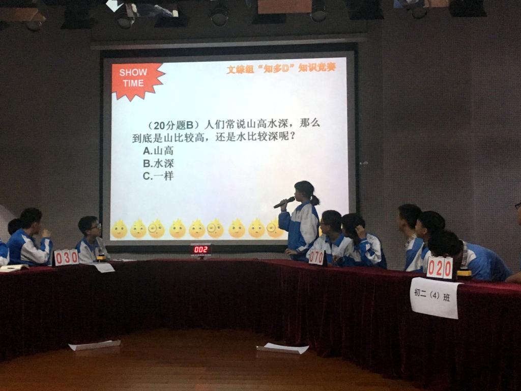 本网讯 11月27日下午,广外附中举行了第一届“知多D”初二年级文综知识竞赛。此次活动由文综组承办,初二年级各班均派出了精英学生组成队伍参加比赛。