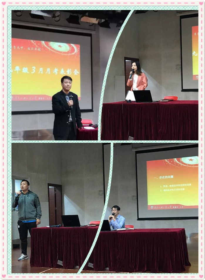 初三年级长吴学斌老师首先发言,表扬了3月月考年级前二十名和单科前五名的学生,总结了开学一个月来初三年级的总体情况,同时希望学生们能做积极的自己,在复习冲刺阶段牢固掌握基础知识,战胜惰性,战胜自己。接着教导处胡琴主任以美国通用电气、迪斯尼电影、阿里巴巴三个世界知名公司的创业历程,引导大家思考,无论企业发展还是个人发展,支撑我们努力拼搏的就是心中的使命感, 唯有肩负使命,方能追求卓越。接下来初中部袁宇迪校长表达了对本届初三的关心,希望学生们明白月考和考试后总结的意义,增强自信心,制定学习目标,合理安排学习时间,做学习的强者。最后,为了迎接两天后的体育中考,体育组林伟忠老师给学生强调了体育中考的各类注意事项,事无巨细,面面俱到,相信在我校体育老师的带领下,我们初三年级的体育中考定能首战告捷,取得优秀的成绩。