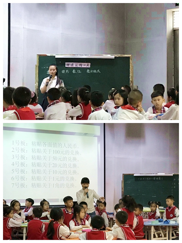 邝少仪老师以参观人民币展馆,帮助馆长设计不同币值的展板展开复习教学,孩子们对人民币的知识及简单的计算进行了梳理与整理。两位老师均给听课老师呈现了精彩的展示。
