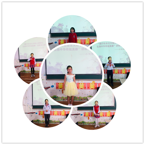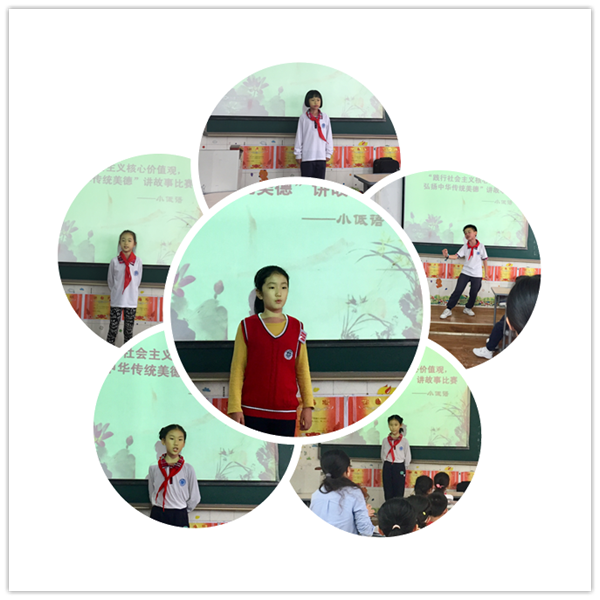 来自一至三年级的十八位小选手,认真准备,精彩演示,声情并茂地为我们送上了一场充满童趣又具启发意义的故事会。他们的故事主题突出,题材丰富。比如,二(5)班刘妍希的《管鲍之交》和三(4)班黄心蕊的《掉进海里的黑人小孩》让我们知道了人际交往相互信任的重要性。三(6)班叶聿杰《迟到的理由》、二(4)班陈沫霏《司马光吃核桃》和一(5)班陈婧尔《华盛顿砍树》都讲述了诚实的重要性。一(6)谢宛庭《有意义的一堂课》用“你长大想成为怎样的人?”启发我们从小学习爱国、敬业、诚信、友善的重要性。