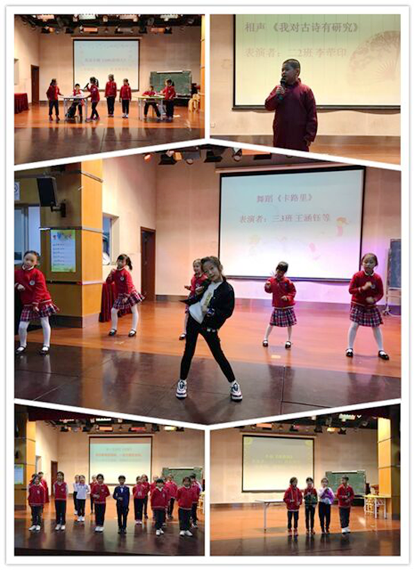 活动开始,三年级六个班分别准备了精彩的节目。三1班的英语小剧《2018的明天》,小剧是孩子和妈妈互换角色,并配上舞蹈,阐述出孩子的心声,希望在自己学习期间自由、快乐,享受童年!三2班的相声《我对古诗有研究》,风趣幽默地介绍出李白饮酒写诗、白居易的乐天派诗集、苏轼诚信真实地写诗,学生在笑声和掌声中学到了古诗的趣味。三3班动感、快乐的舞蹈《卡路里》,音乐一响,此时的云山礼堂氛围是诚信、快乐、有节奏的。三4的“古诗背诵:有女生背的《中和乐九章·总歌》,有男生熟背李白的《酬崔侍御》节选,有齐背的《子箴》,孩子们背得抑扬顿挫、朗朗上口,听得学生也若有所思,希望他们像诗中所写:做一个“诚实守信、品行高操”的人。不知不觉就轮到三5班的家庭诚信小品《逗你玩》,孩子们幽默风趣的表演,逗得孩子们哈哈大笑。三6班《乐器串烧》的精湛表演,让演出达到了高潮。