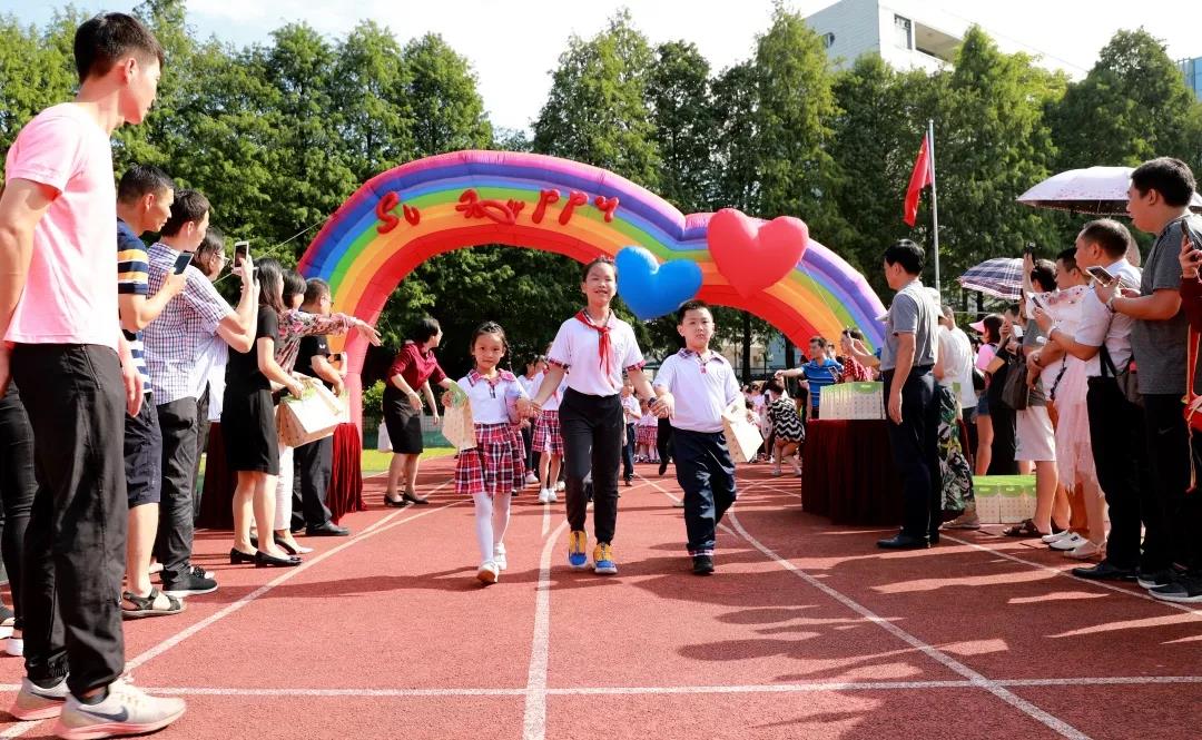 童蒙之学,始于衣冠;先正衣冠,后明事理。同学们先自正衣冠,再互正衣冠。在六年级哥哥姐姐的带领下,一个个精神抖擞,神采飞扬,愉快、有序地穿过彩虹拱门。