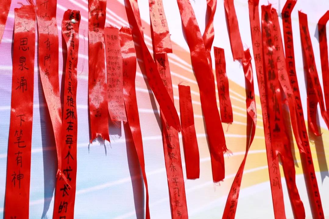“我要好好学习、天天向上”“我要做个有用的人”……在快乐的歌声中,家长们有序地将写满祝福的红丝带张贴到了背景墙上。一条条红丝带,就是家长们一个个美好的祝愿。这些迎风飘扬的祝福丝带,就像孩子们多姿多彩的未来。
