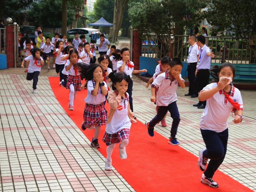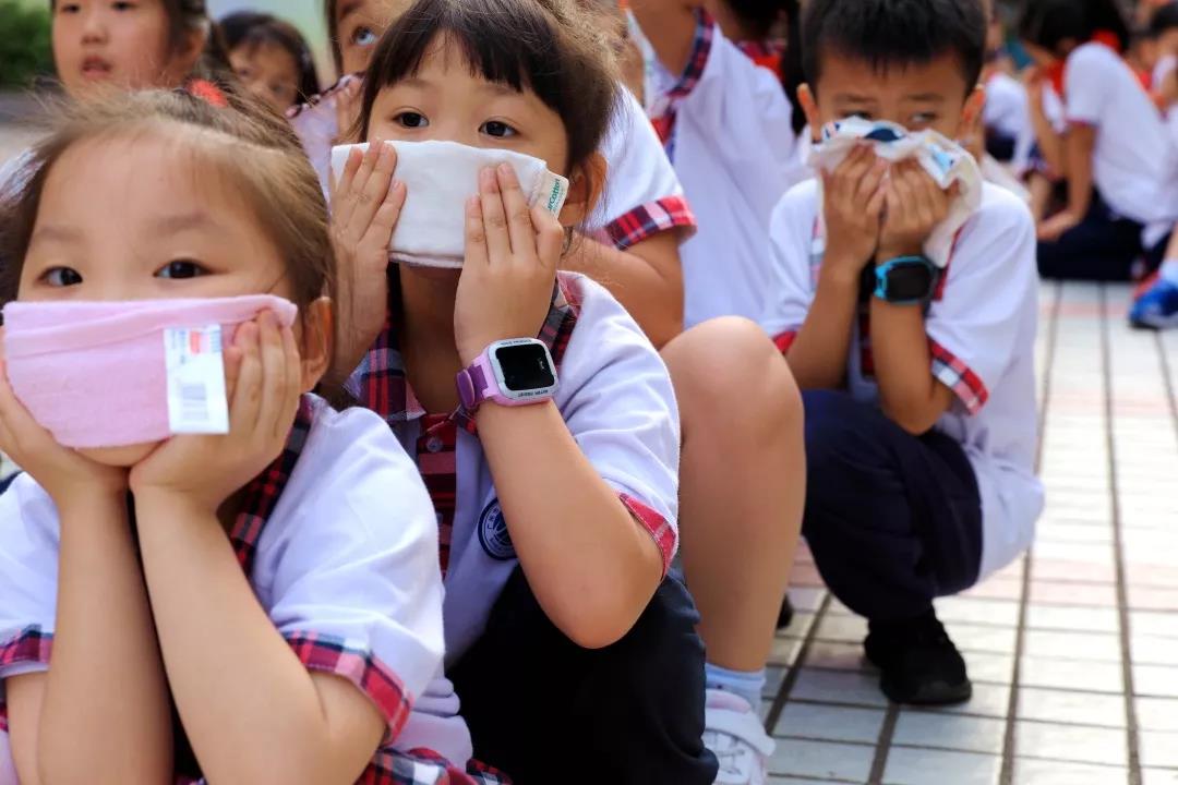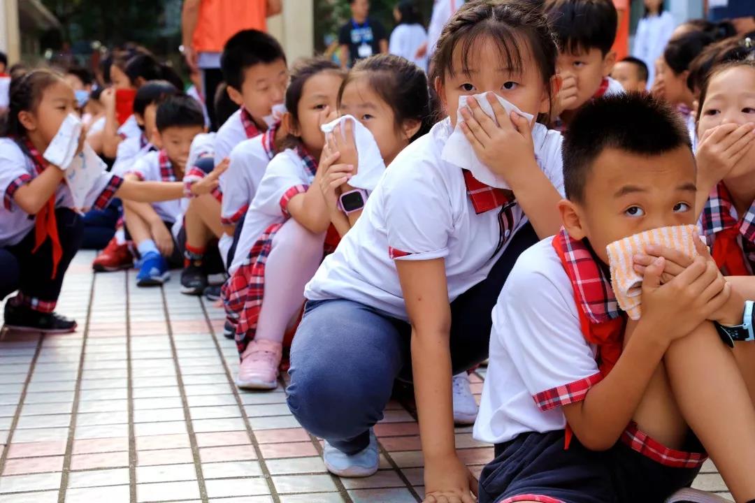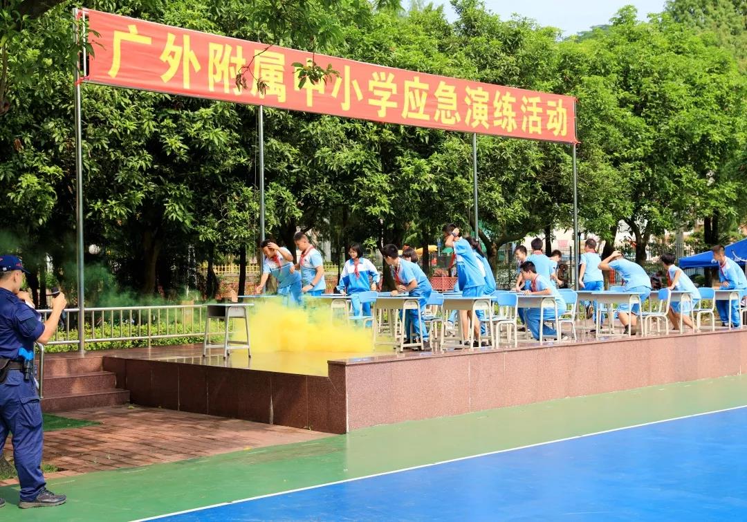 10:10,校内猛然响起几声巨大的爆炸声,浓烟弥漫了整个校园,原来学校里突发“火情”和“地震”了。警报声顿时响起,各班老师迅速组织学生从教室撤离,只见同学们有的猫着腰、抱着头,有的用手、袖子捂住口鼻,紧张、快速、有序地按预定的疏散路线到达大操场。全校2100余名师生,用时不到4分钟就全部到达了安全区域。