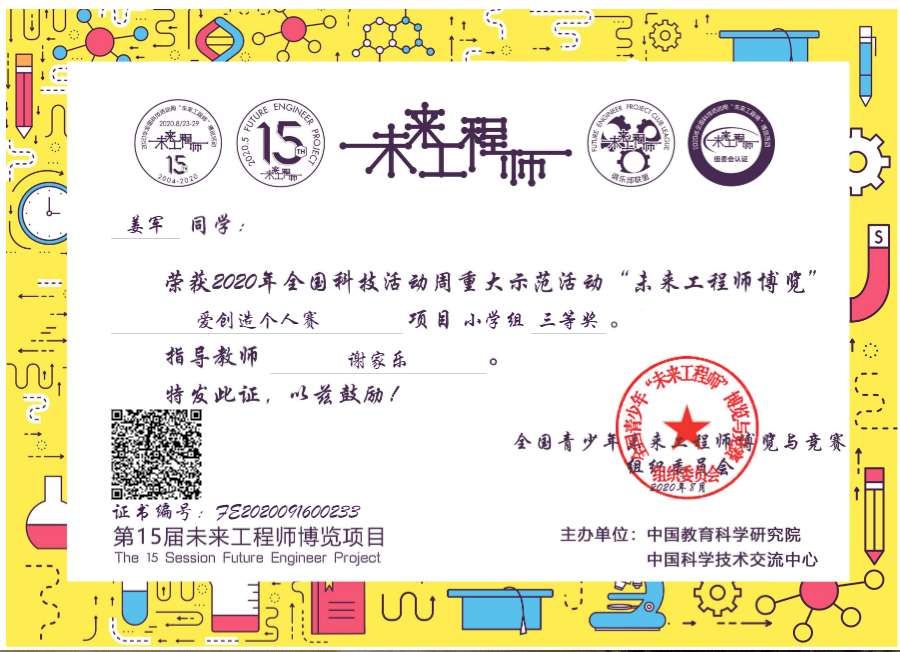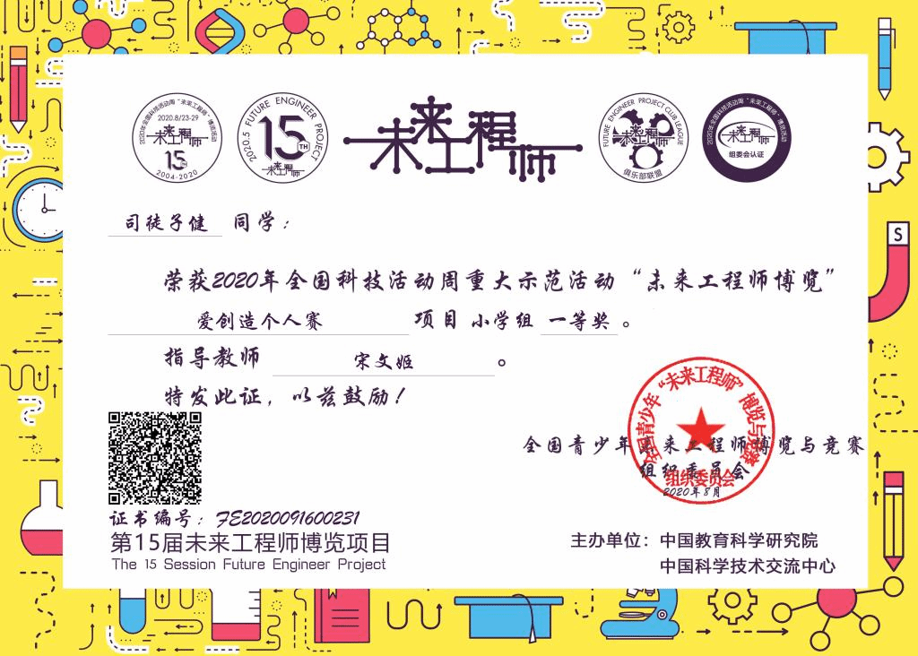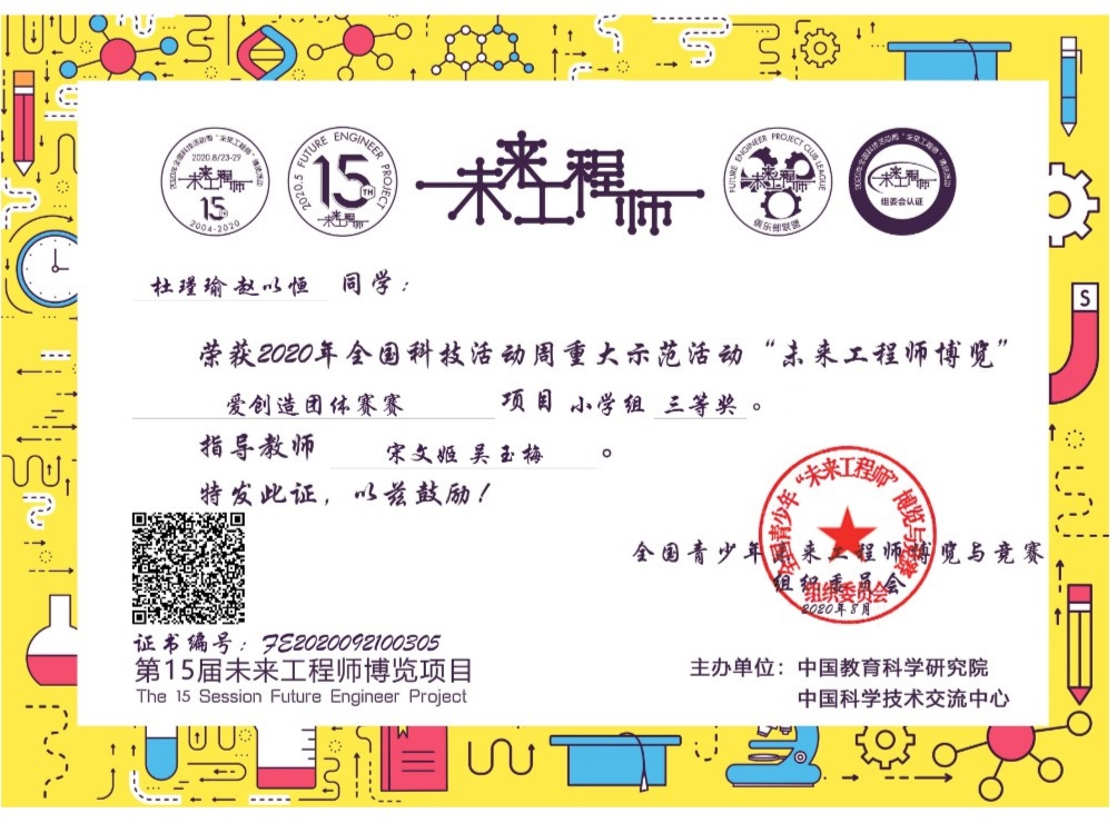 由中国教育科学研究院、中国科学技术交流中心主办的2020年全国科技活动周重大示范活动“未来工程师博览”之“爱创造”项目中荣获一等奖、二等奖、三等奖共计12项。