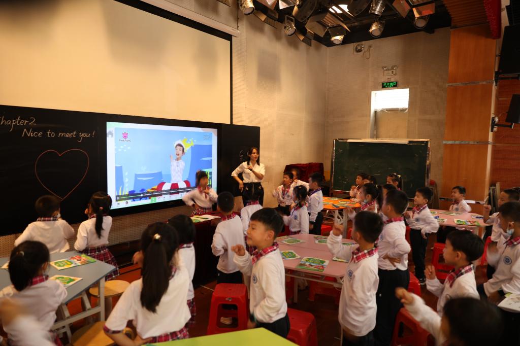张秀琴老师的英语课堂,又是一番不同的风味。一(1)班的小朋友们在老师的带领下,轻松愉快地演唱英语儿歌,玩单词游戏,,分角色表演对话,小组内练习用英语介绍家庭照片等,课堂学习氛围较浓厚。作为刚入学一个多月的孩子们,在英语口语表达和课堂常规方面都有明显的进步。