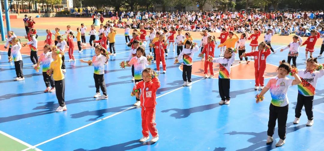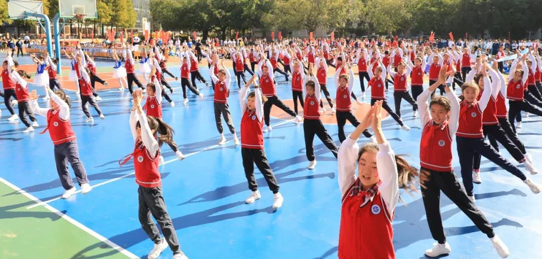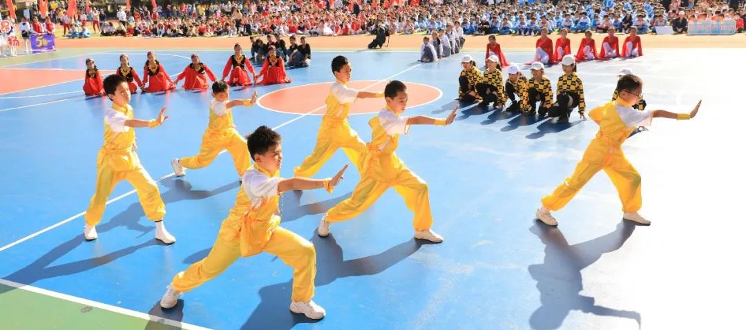 五年级组婀娜多姿的新疆舞和中华武术开场,街舞少年和古风少女一起演绎着我运动,我健康,做身心健康全面发展的学生。