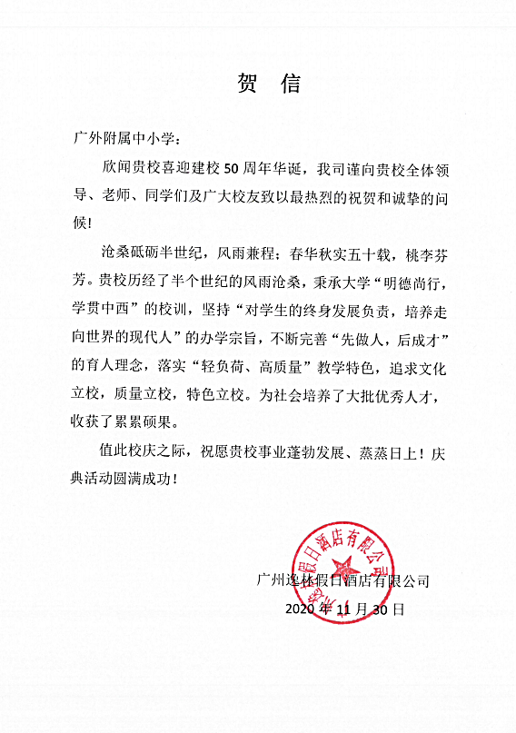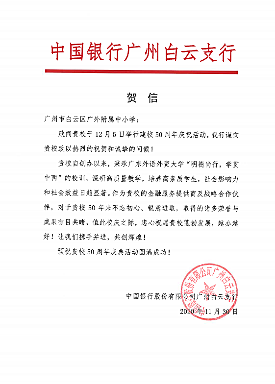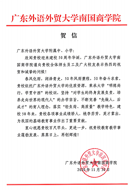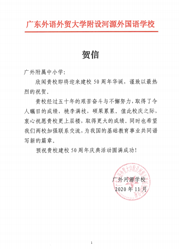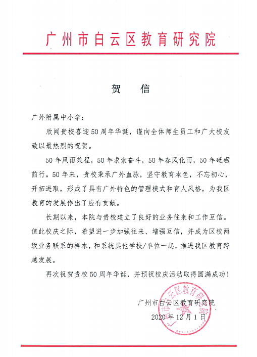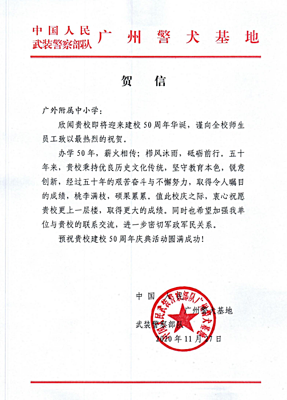 在过去的50年里,广外附属中小学得以持续稳健发展,不仅依靠全体员工的耕耘和付出,还离不开各级领导的亲切关怀和社会各界友好单位的大力支持。值此50周年校庆之际,前来学校祝贺的领导、友好单位、热心人士络绎不绝。