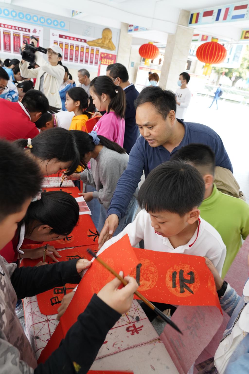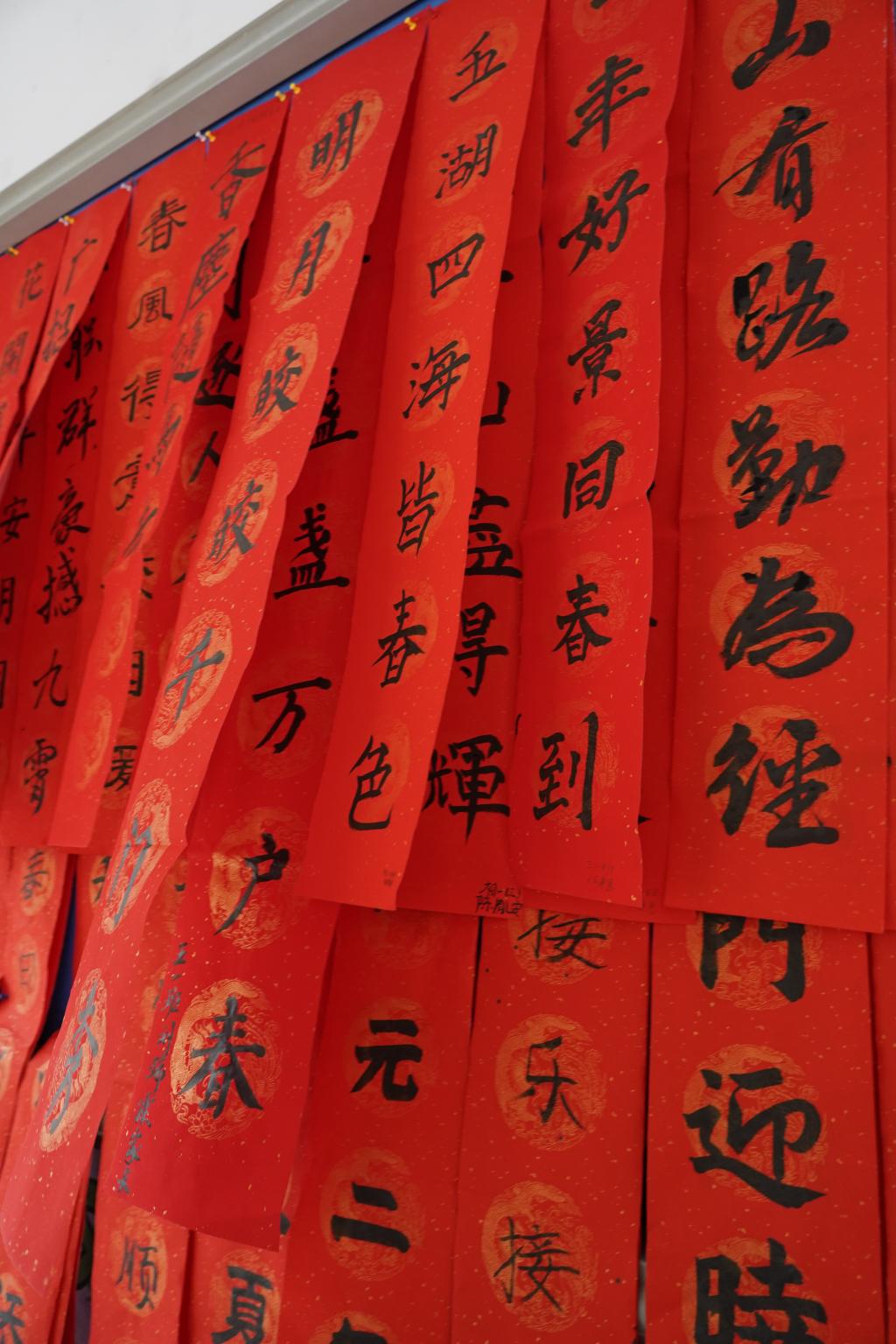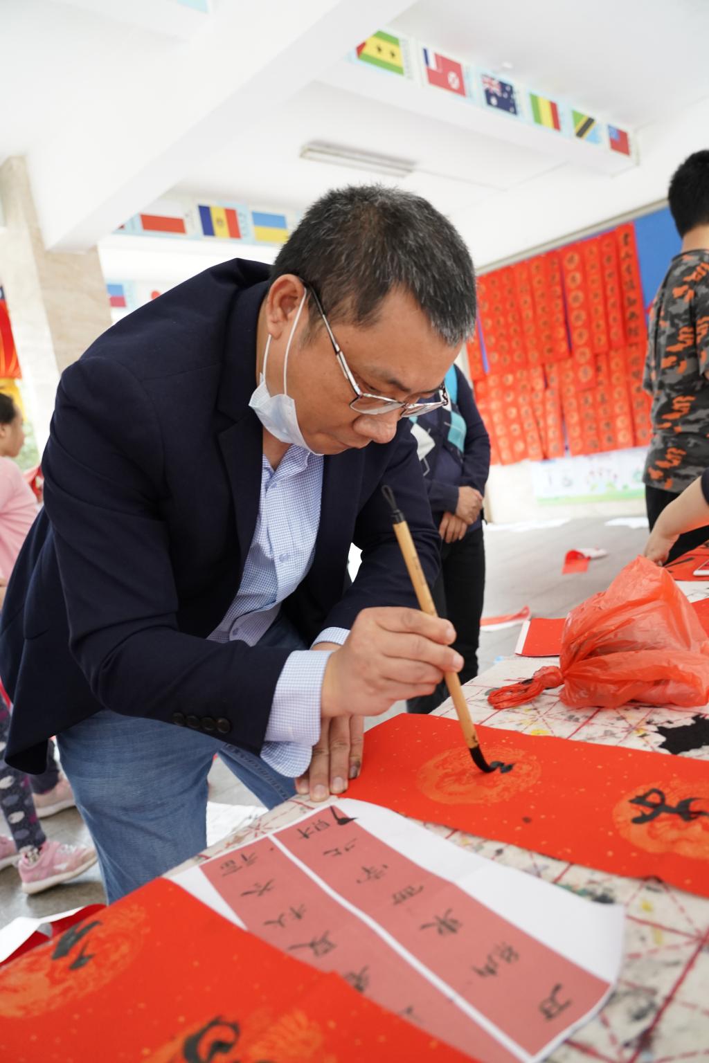 “无联不成春,有联春更浓。”学校早已为师生们准备好“文房四宝”,在老师的指导下,同学们挥笔泼墨,一个个福字,一幅幅对联应运而出。现场的欢声笑语与翰墨飘香相互交织。同学、老师、家长们一起书写油墨飘香的春联,张贴在校园里,用自己的才艺和爱心为校园装点了别样的风景。