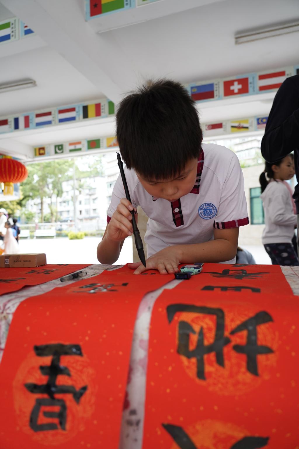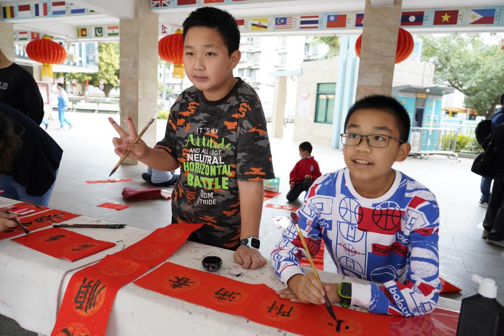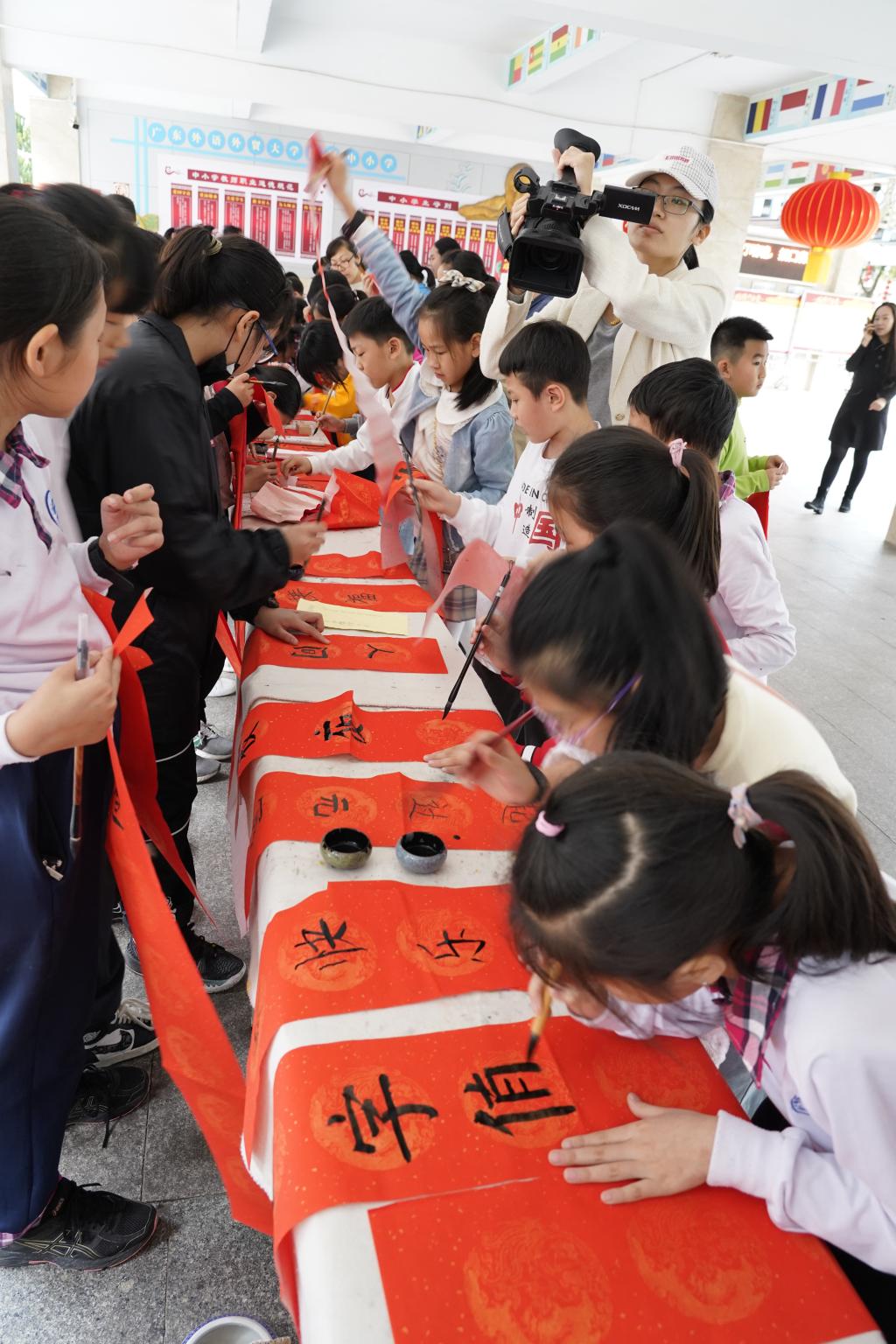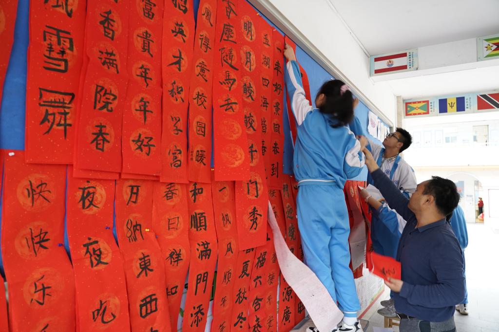 “无联不成春,有联春更浓。”学校早已为师生们准备好“文房四宝”,在老师的指导下,同学们挥笔泼墨,一个个福字,一幅幅对联应运而出。现场的欢声笑语与翰墨飘香相互交织。同学、老师、家长们一起书写油墨飘香的春联,张贴在校园里,用自己的才艺和爱心为校园装点了别样的风景。