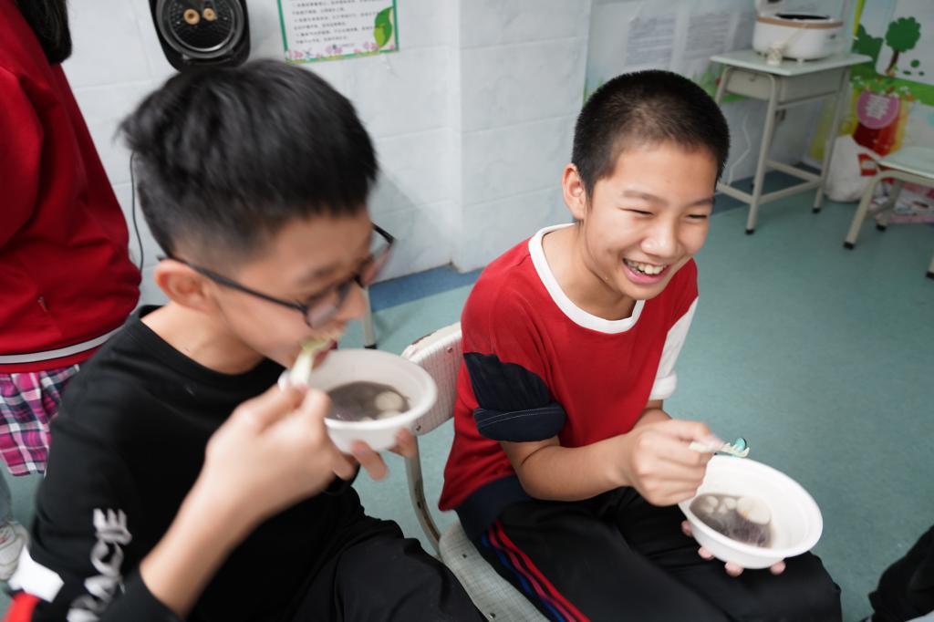 “元宵鼓鼓,幸福满满;元宵甜甜,快乐绵绵。”在同学们参与快乐的游园活动时,教室里面,老师和家长早已为大家煮好了一锅热腾腾的汤圆,有芝麻馅的,有花生馅的。有的班级还亲手包起了汤圆,汤圆甜甜的味道,在教室中蔓延。同学们满足地捧着汤圆,温馨地围坐在一起品尝,一起享受此刻欢聚时光,甜蜜时刻。