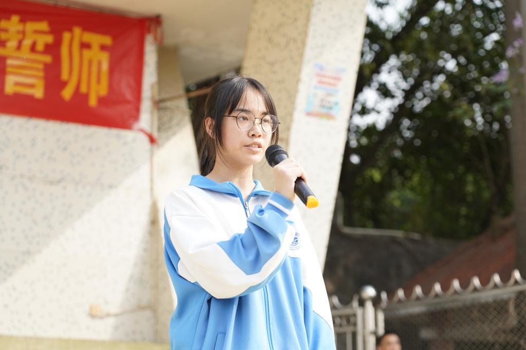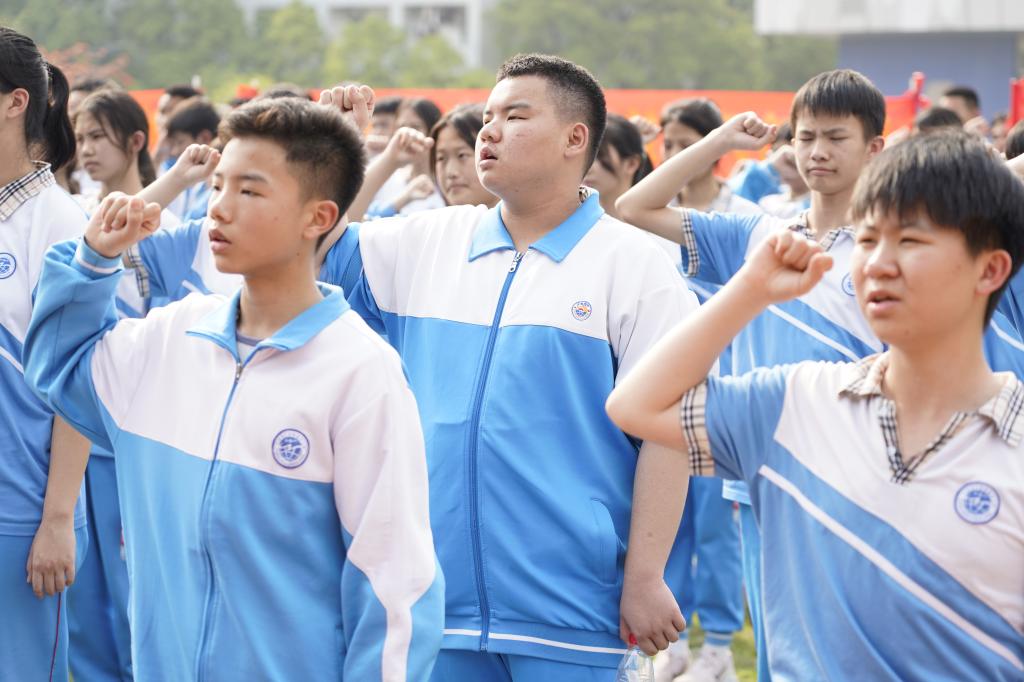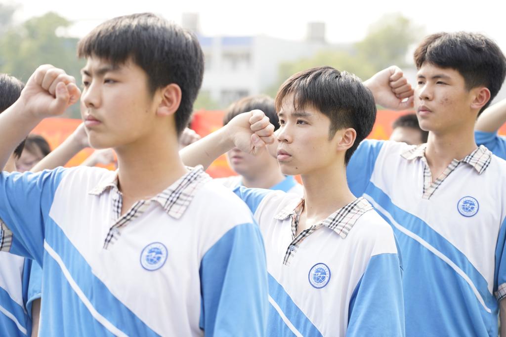 学生宣誓:“十年寒窗磨利剑,七月沙场试锋芒;一百天,最后的冲刺,一百天,改变我一生。我是父母殷切的期望,我是自己命运的主宰。今天我以青春的名义宣誓:一百天,战场演习,我不退缩;一百天,考场挥毫,我能胜利!我有老师的引导,我有父母的关心,一切都有可能,永不放弃!我自信,我尽力,我成功!一百天,我要拼搏,用汗水浇灌我理想的花蕾;一百天,我要高歌,用行动兑现我青春的诺言!是的,七月凯旋,舍我其谁!”