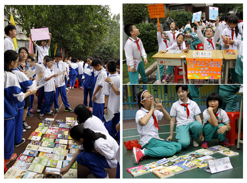 本网讯 4月16日下午,广外附属中小学校园里人声鼎沸、人山人海,热闹非凡。在小操场、前后楼通道、大操场,小学各年级、初一、初二年级的同学们带来各式各样的图书,摆开档口,打出宣传标语,喊一声“卖书咯”,一时间叫卖声、笑声、讨价还价声不绝于耳,第六届读书节“图书换购”活动开始啦!