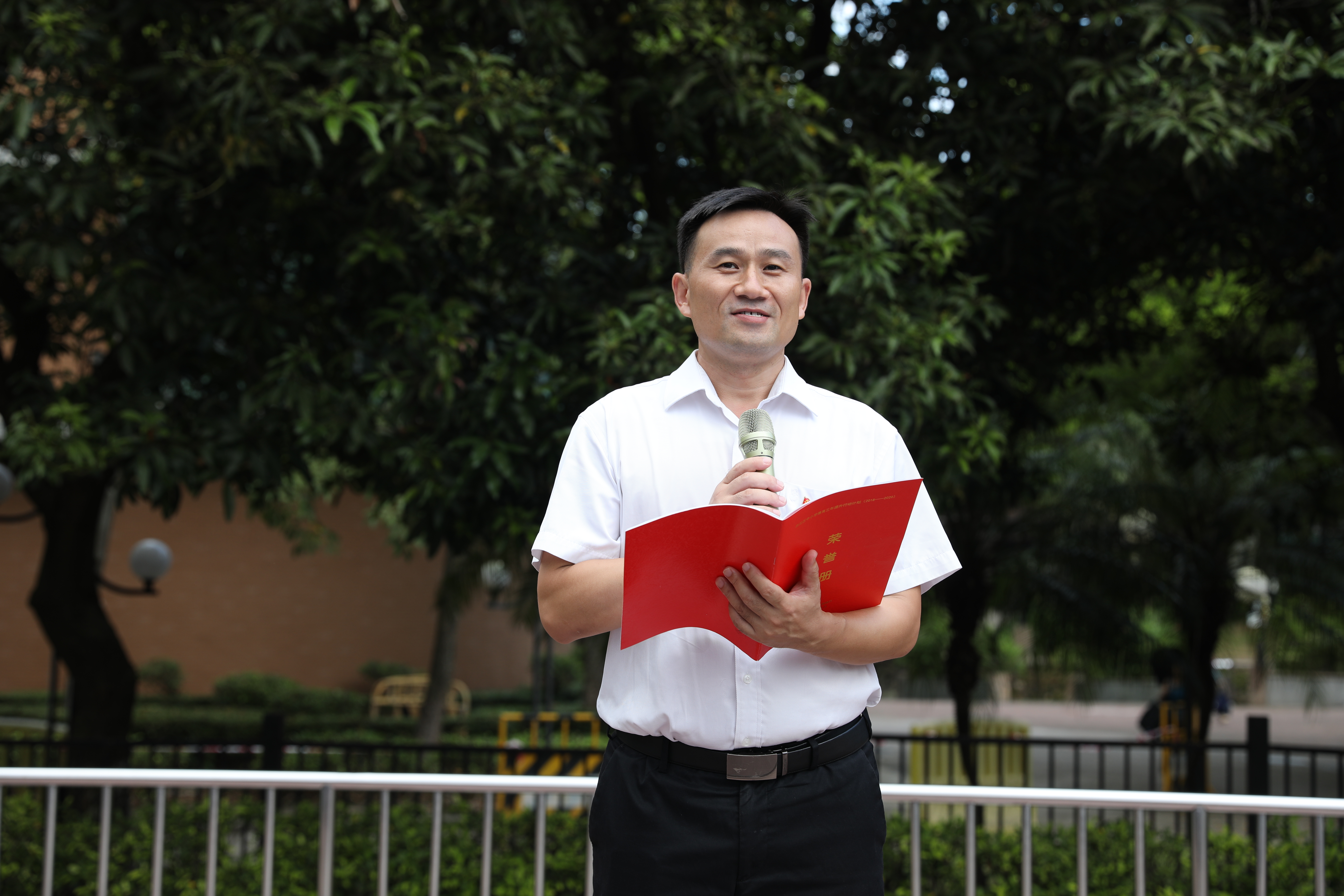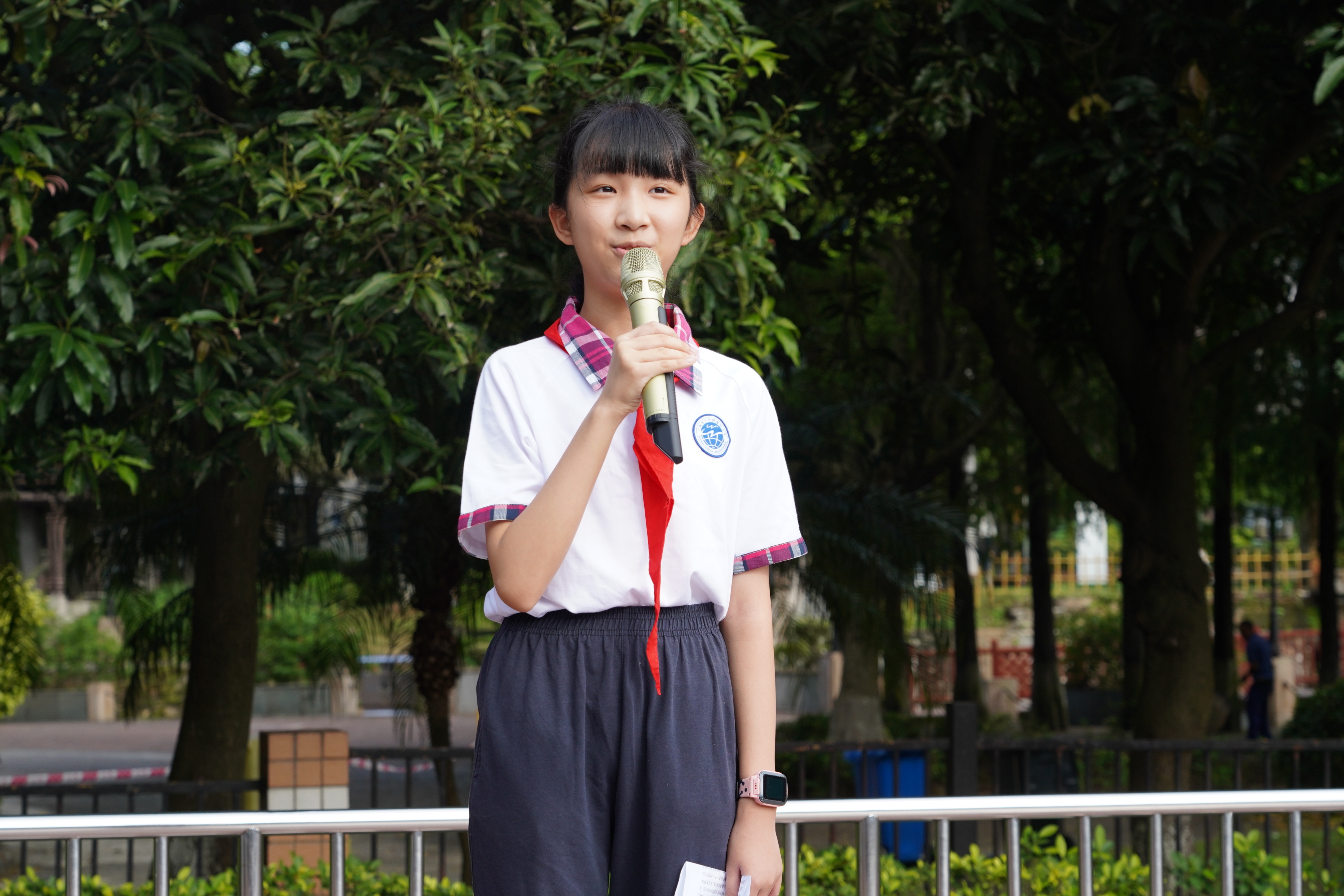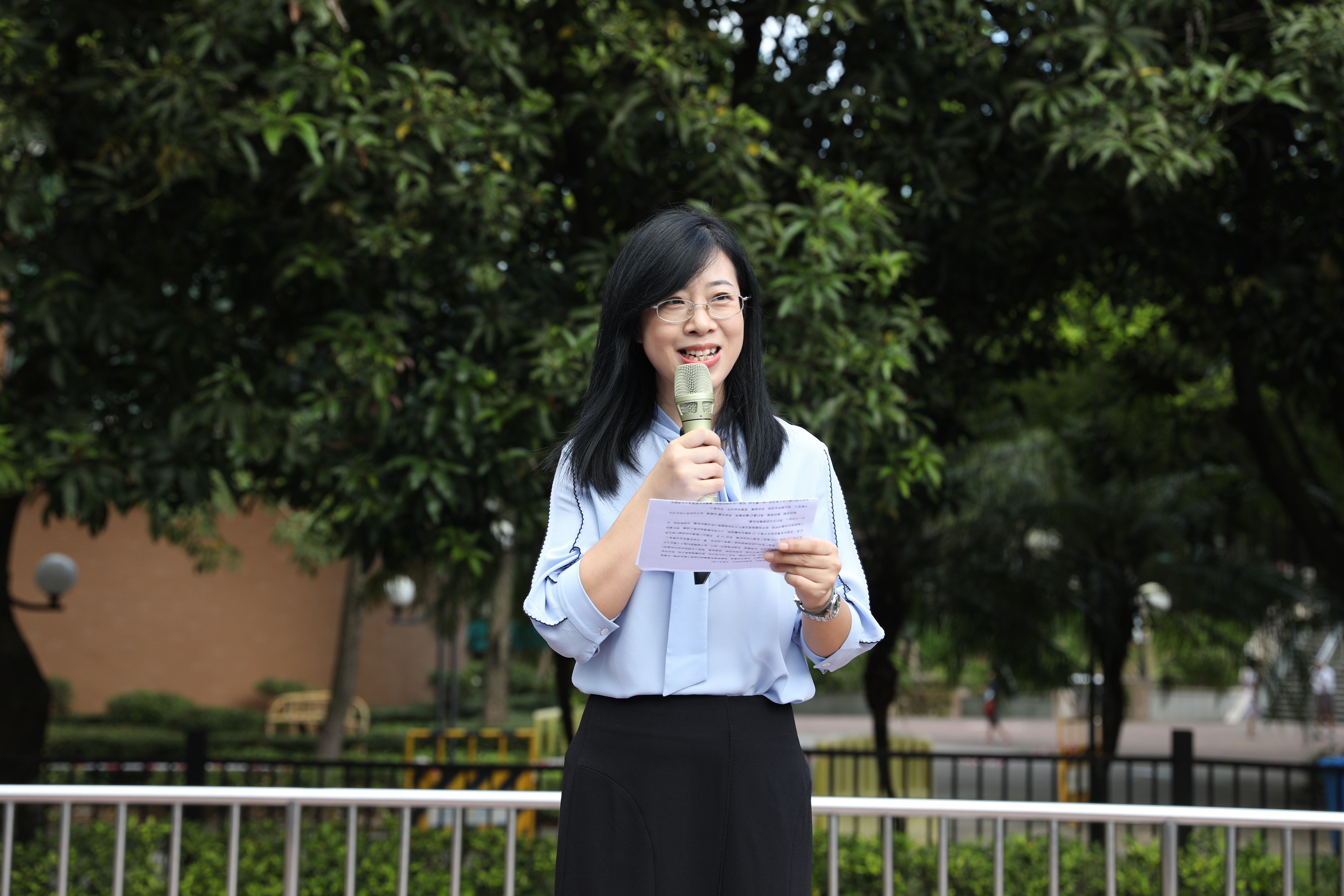 中学英语老师杨波作为教师代表发言。杨老师声情并茂,不仅回顾了同学们在暑假期间的所学所获,也带领着同学们对新学年的学习和生活展开了期望。她激励大家勤勉奋斗、拼搏超越,珍惜时间,扬帆鼓劲,用最勤恳的姿态,用最执着的努力书写附校人的精彩每一天。杨老师的发言引起了全场师生的共鸣,赢得了阵阵掌声。