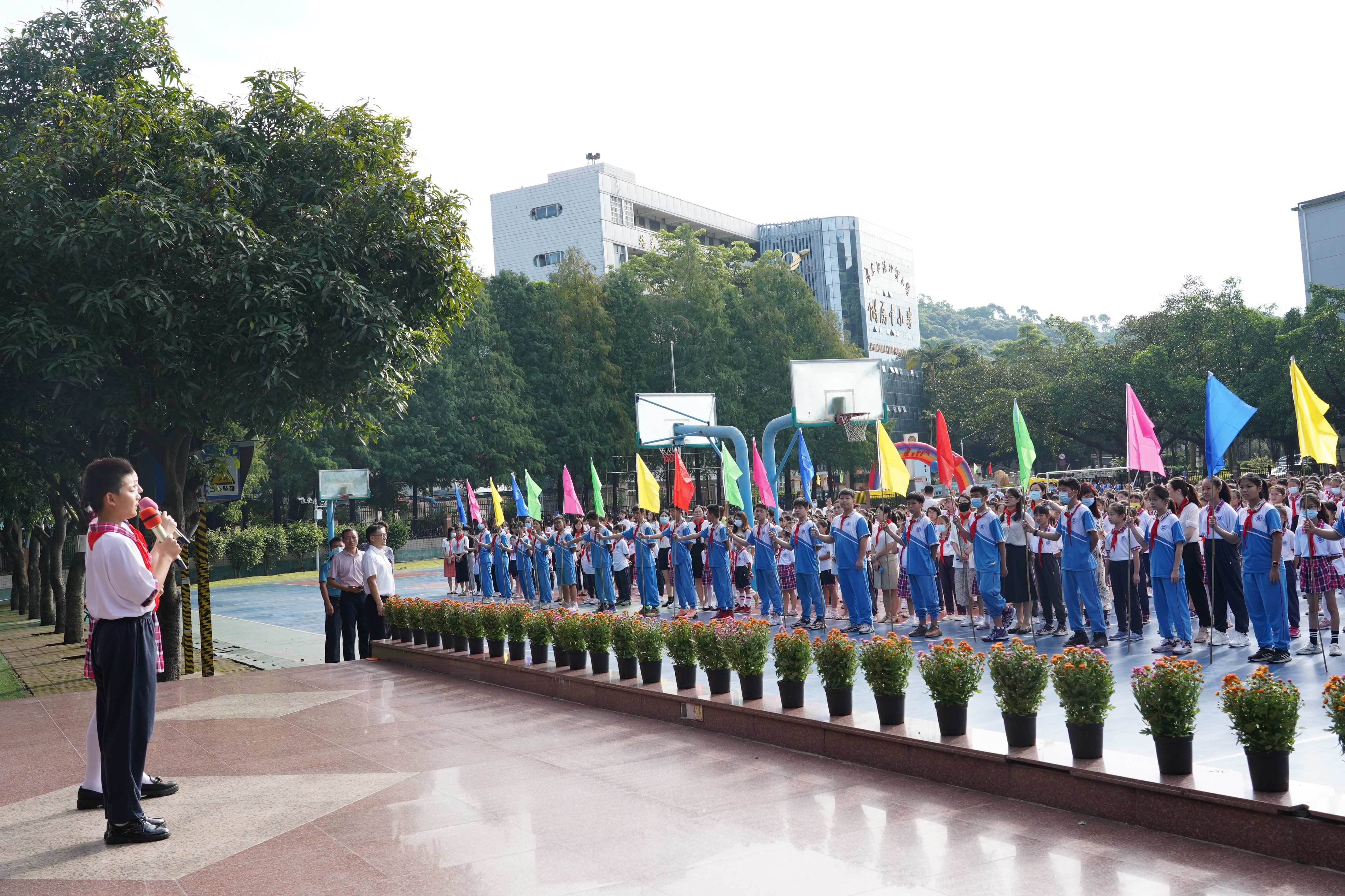 在国旗护卫队、彩旗队、鼓乐队的默契配合下,在全校师生激情饱满的国歌声中,庄严肃穆的升旗仪式拉开了开学典礼的序幕。