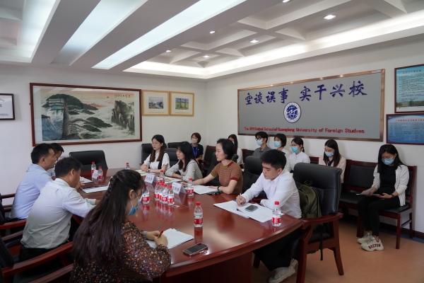 会上,袁宇迪副校长代表我校对广东外语外贸大学团委刘庆丹副书记、陈琳琳老师和实习生们的到来表示热烈的欢迎,袁校鼓励实习生们作为新生的年轻力量,要主动积极地把先进的想法融入到教学实践工作中,同时表示我校教师教学经验丰富,在指导过程中会加强交流与学习,把好的实践经验毫无保留的传授给实习生们。