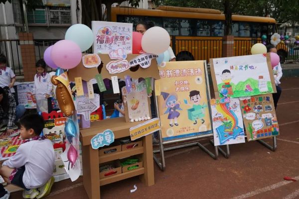“藏书阁、阅乐书店、书海拾贝、书香小屋、三味书屋、爱心书店、图书漂流驿站、致远书屋......”班主任、老师、家长和同学们提前来到操场,精心布置了各班的“图书换购”摊位,贴上了创意的店名和孩子们自己设计制作的色彩缤纷的海报。