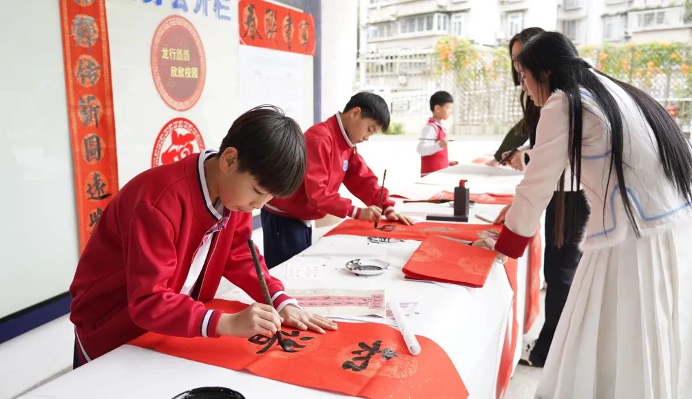翰墨飘香,在比赛现场,老师们早早准备好了比赛现场需要用到的宣纸、墨水、砚台等材料,家长志愿者在场协助。参赛同学即席挥毫,一副副对仗工整的对联跃然纸上,表达了同学们对生活的美好祝愿。