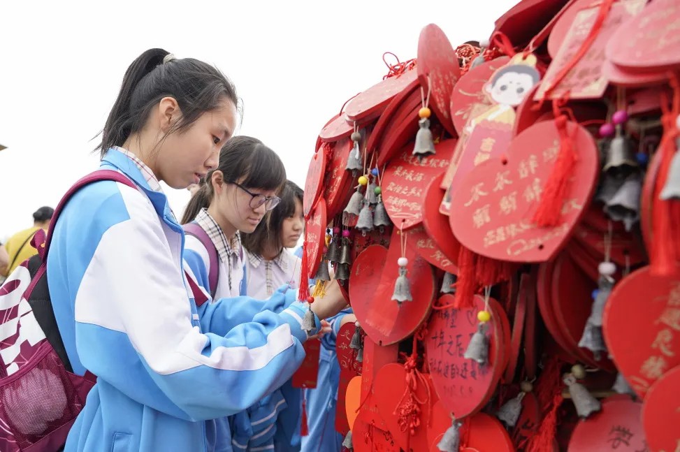 历经了两个多小时的爬坡与休整,大部队成功登顶摩星岭。同学们拿出自己精心准备好的心愿牌,有序地挂在许愿台上,充满了仪式感。