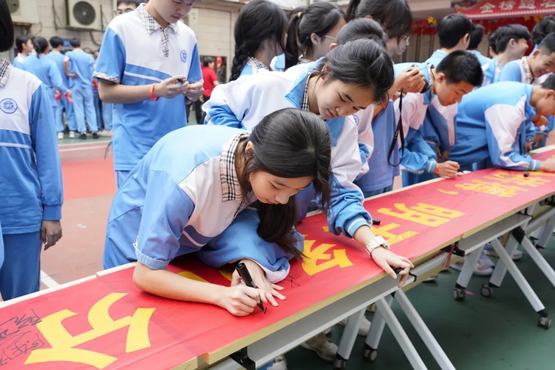 句句叮咛语,片片师爱心,学生们收到了老师们的勉励和祝福。老师们宣誓与学生同心向上,携手奋战一百天,“甘将心血化时雨,润出桃花一片红。”