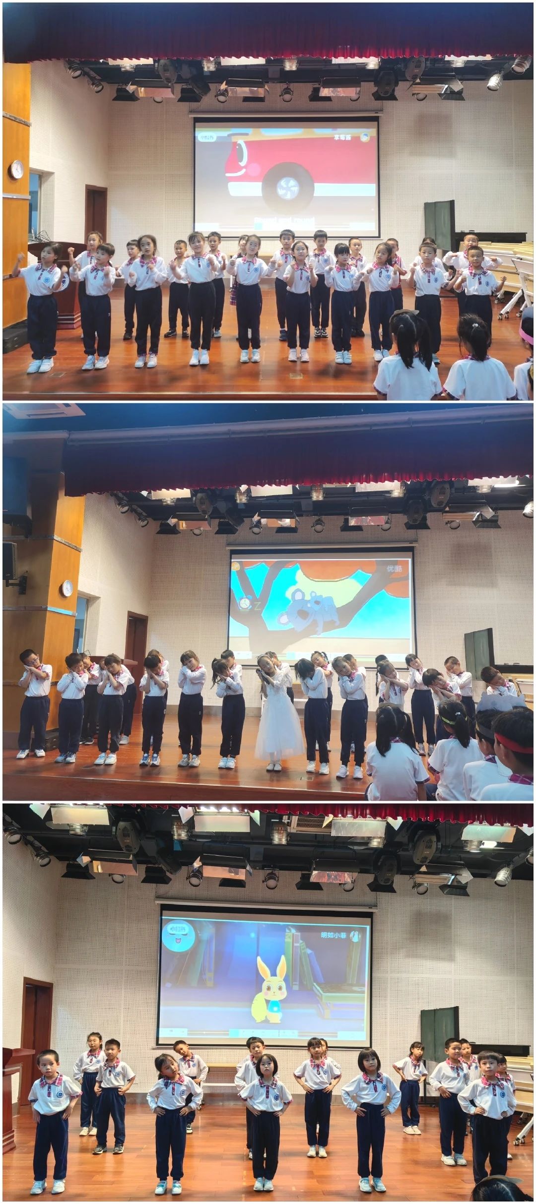 4月12日下午,全体一年级学生汇聚学校云山礼堂举行英语童谣展演。各班同学熟练唱诵英语童谣,配上生动的动作,快乐演绎,赢得了在场老师和同学们的热烈掌声。歌曲动感活泼,表演形式丰富多彩,有歌谣律动,有舞台剧表演,生动形象趣味横生。英语歌谣唱诵出同学们对学习英语的无限热情。